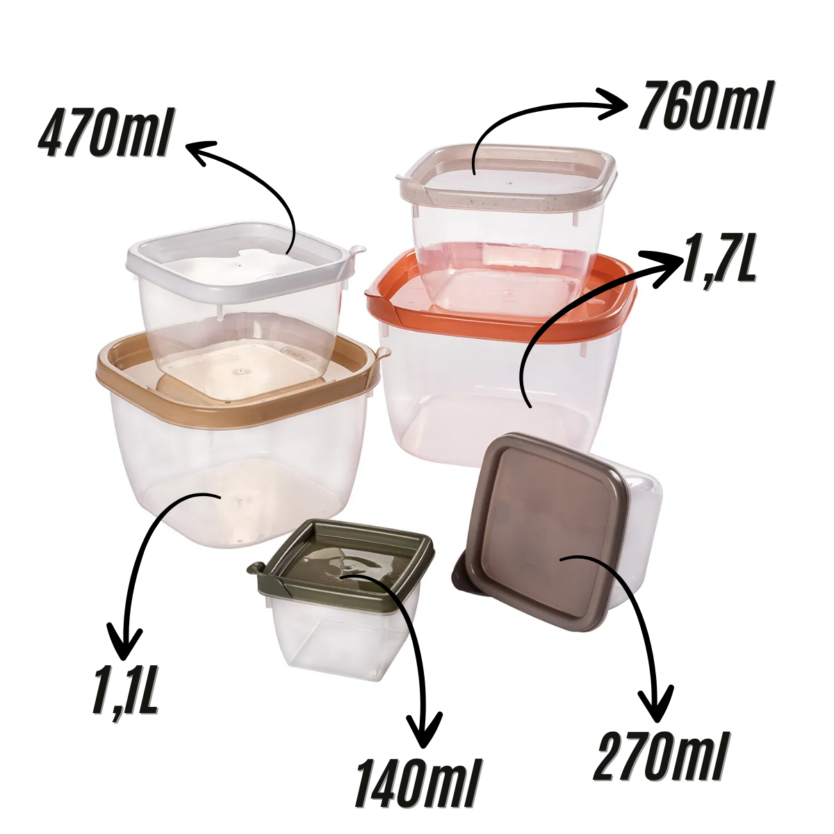 - Capacidades dos potes: 140ml, 270ml, 470ml, 760ml, 1,1 L, 1,7 L