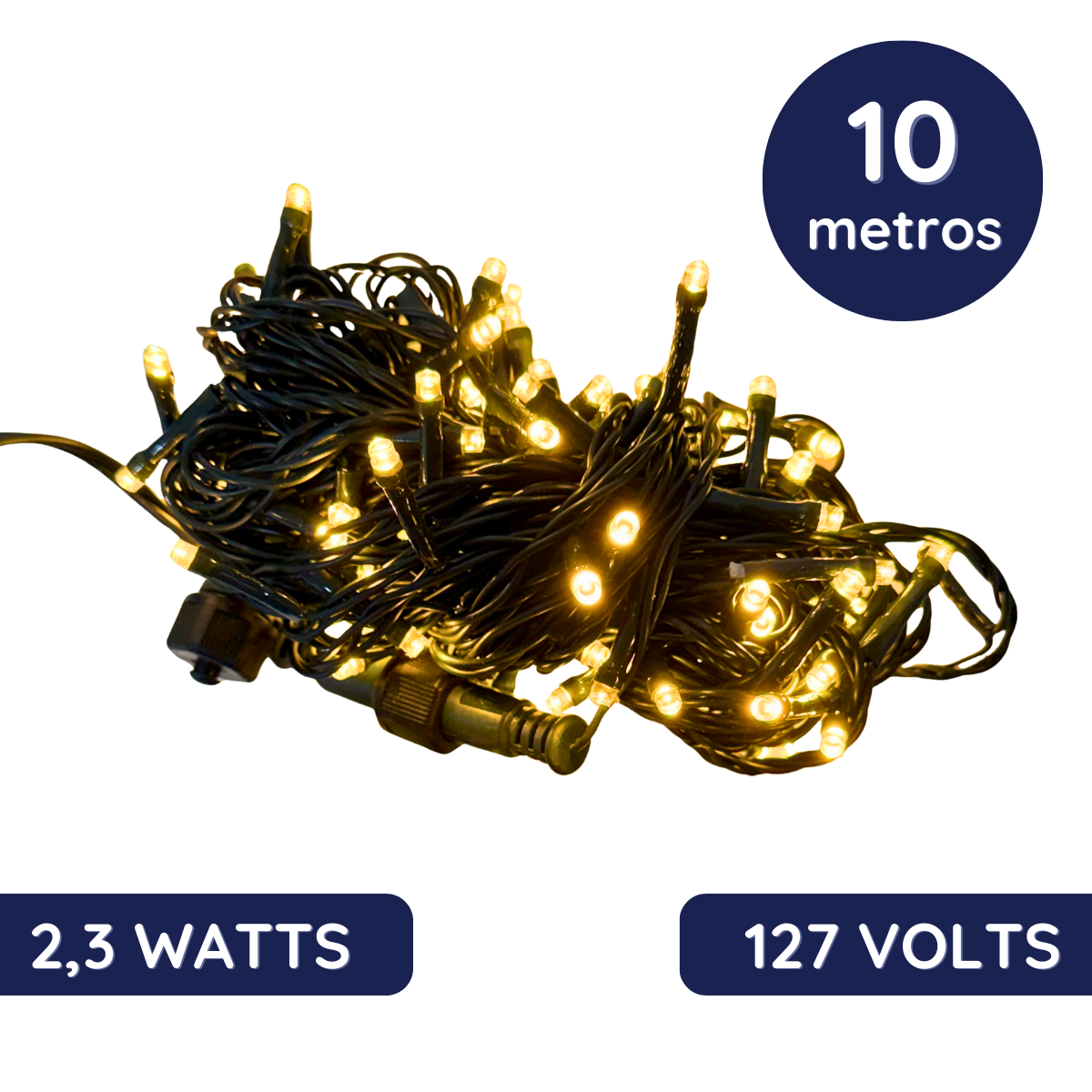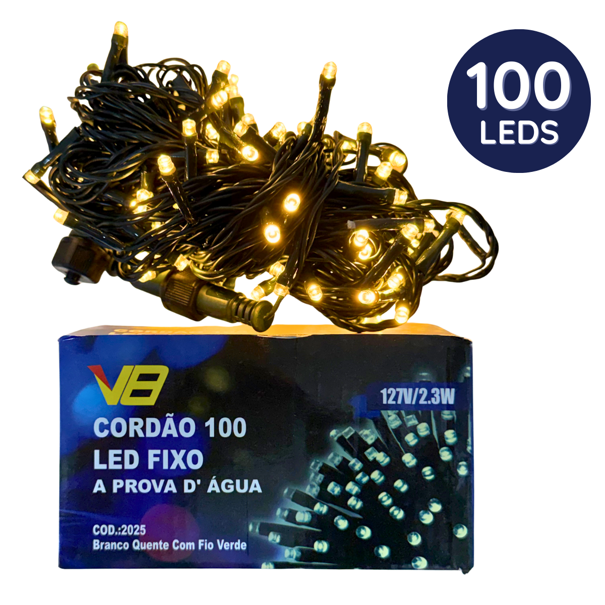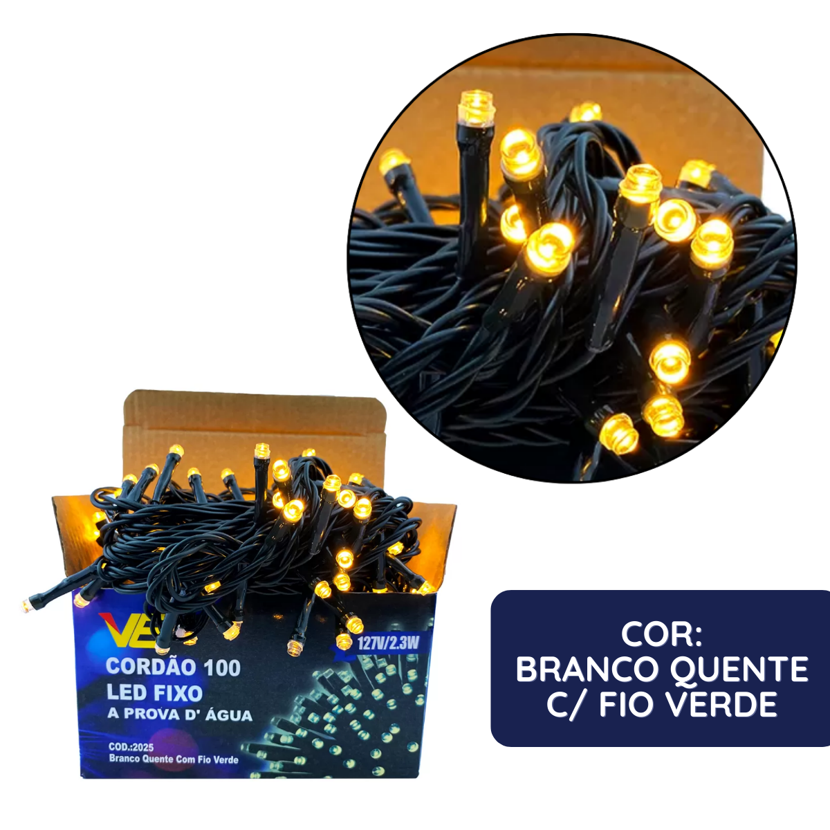 Cordão de Luz 100 LEDs Fixo 10m Branco Quente com Fio Verde
