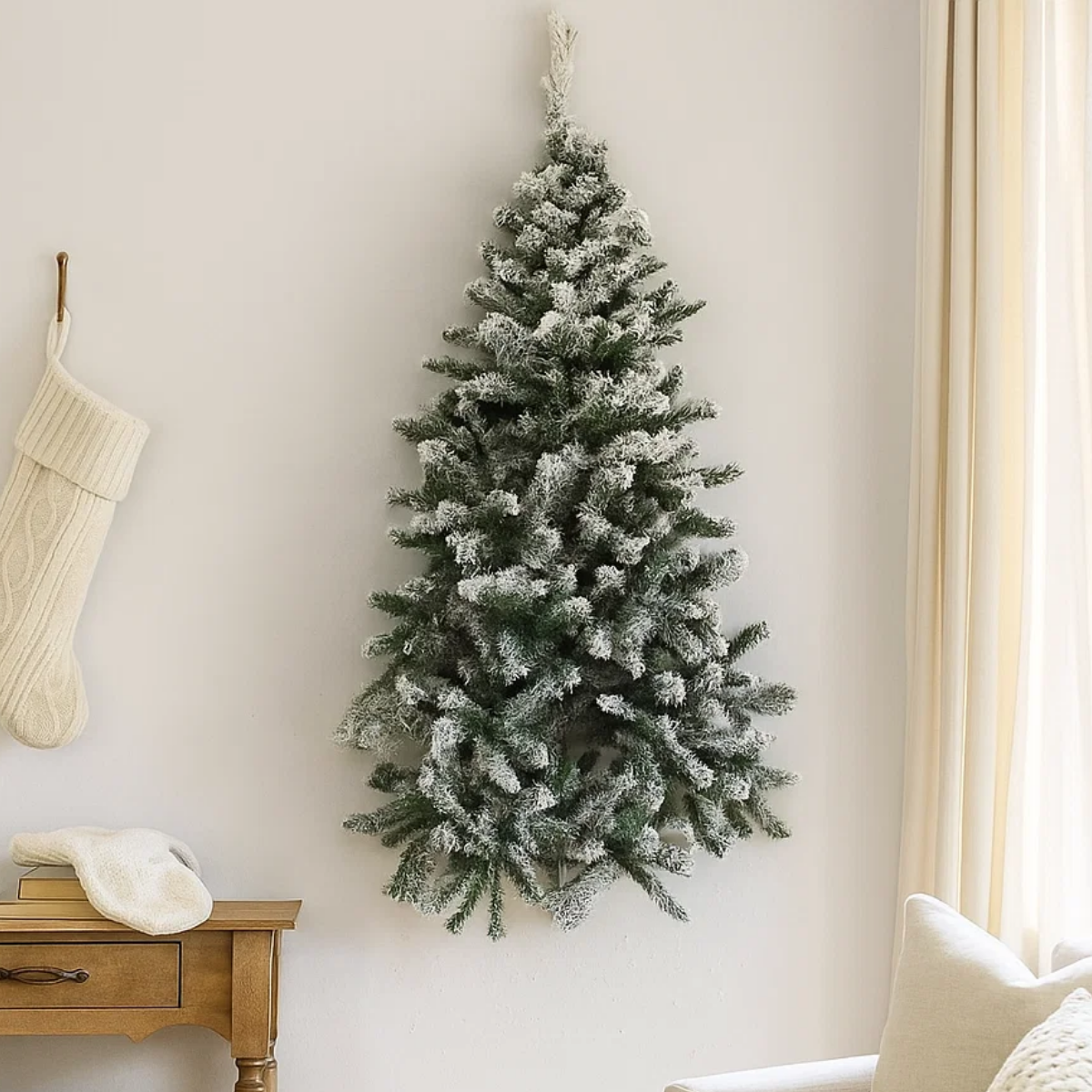 Dica final de uso: Monte a árvore na parede com ganchos discretos e adicione pisca-piscas brancos ou luzes amarelas para realçar o efeito da neve. Finalize com fitas e laços de juta para um toque rústico e acolhedor.