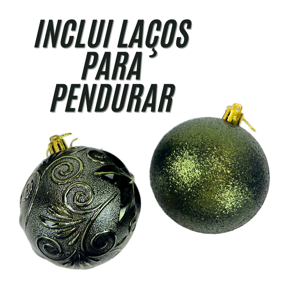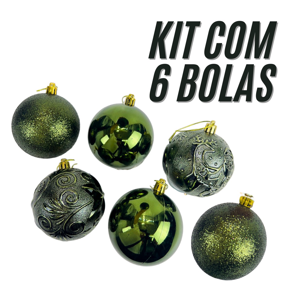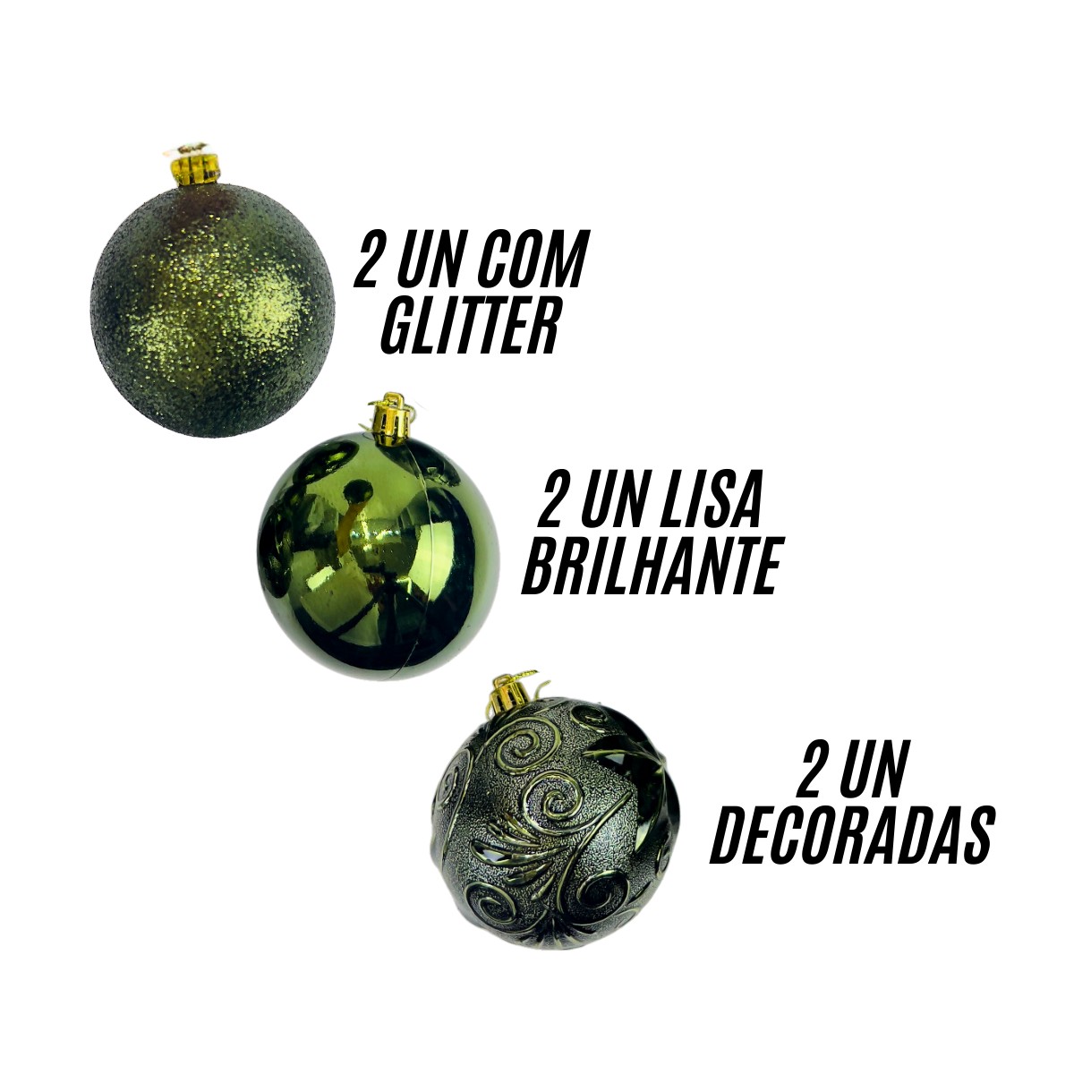 Kit 6 Bolas de Natal Mista 8cm Lisa Glitter Decorada Verde