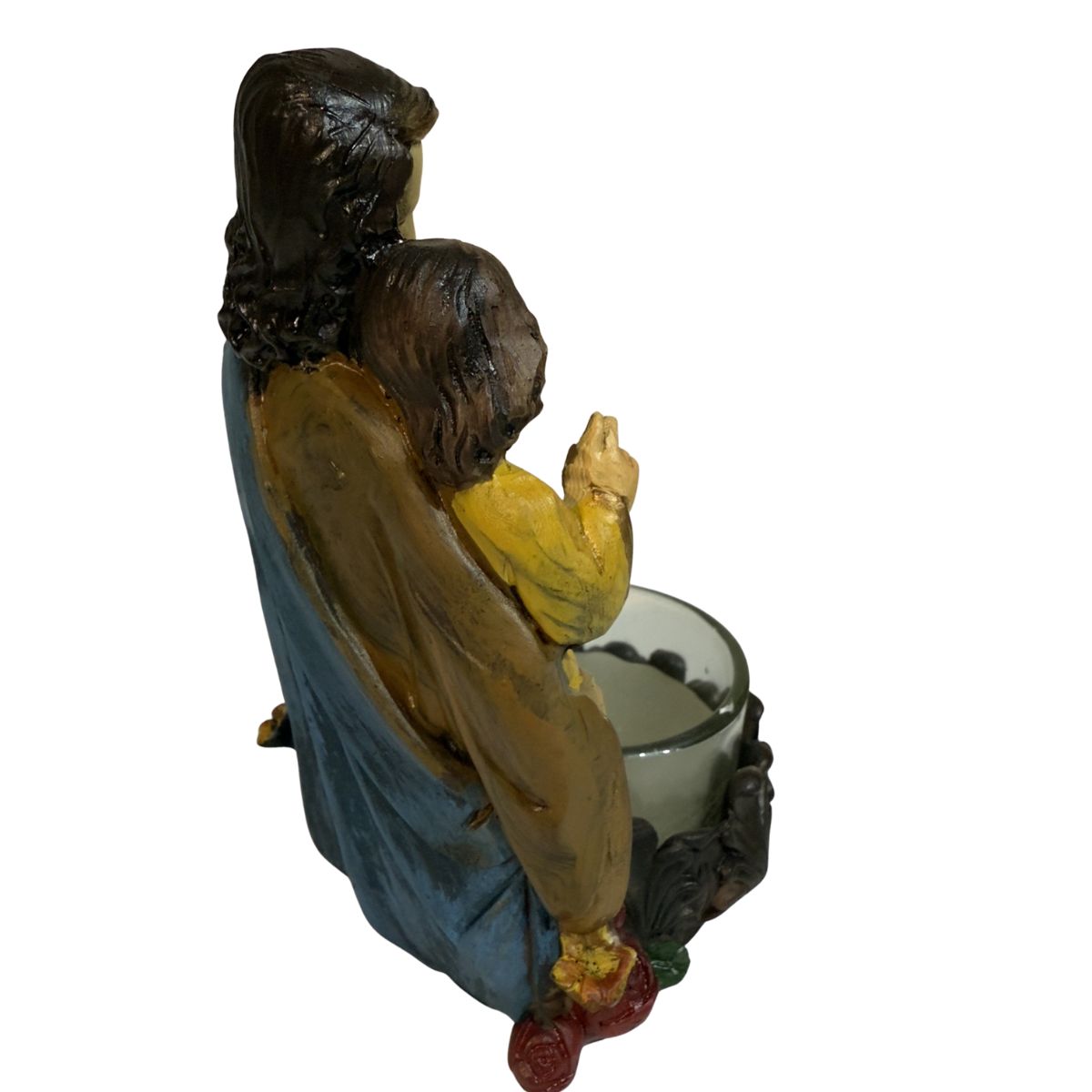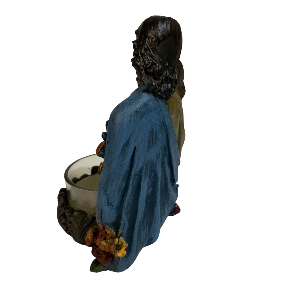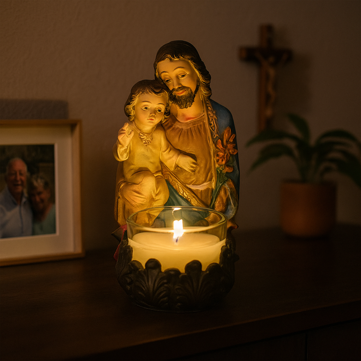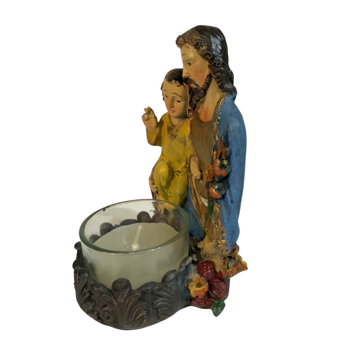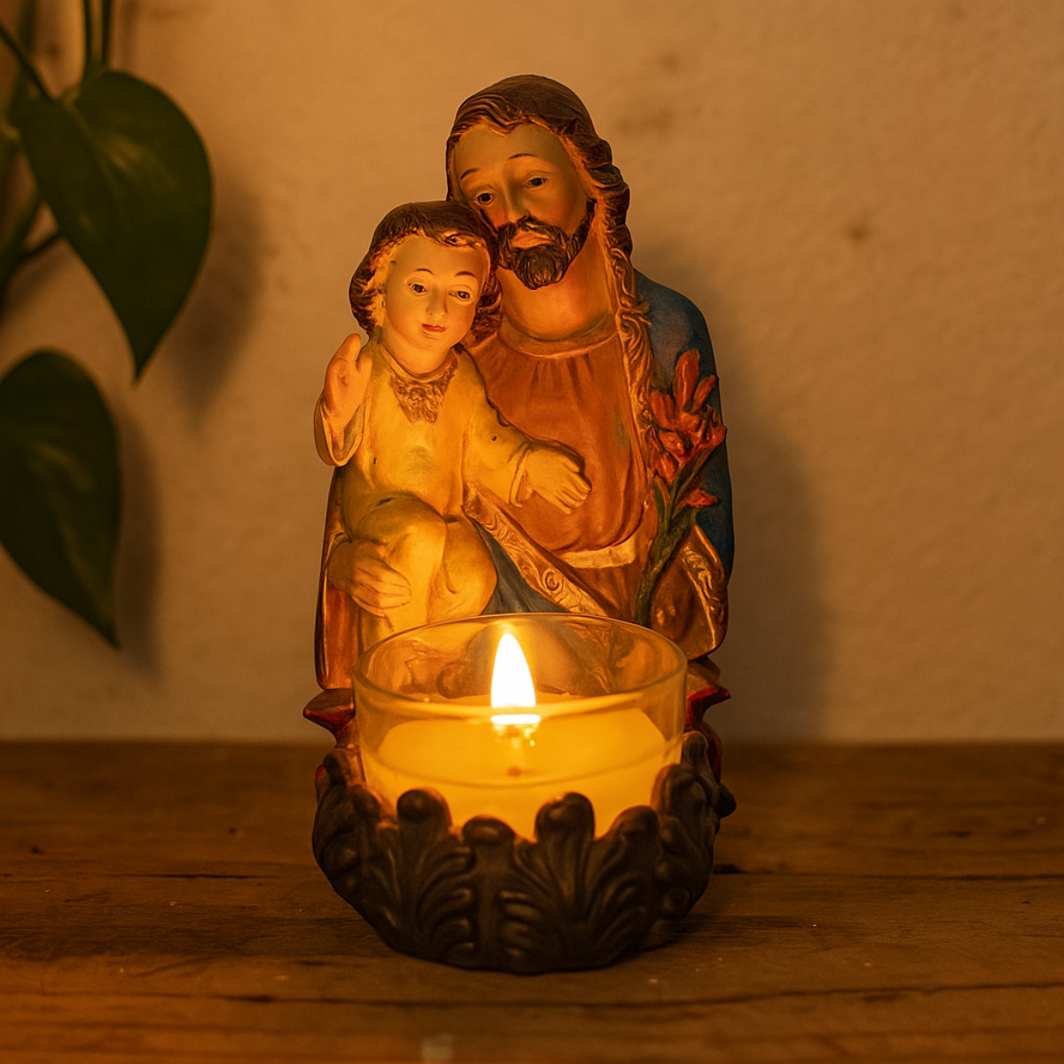 A escultura apresenta São José com manto azul e túnica marrom, segurando com carinho o Menino Jesus vestido em amarelo, simbolizando amor, cuidado e proteção familiar. À frente, um suporte de vidro para vela tipo tealight permite criar uma iluminação suave, ideal para momentos de oração, novenas, meditação e decoração de altares.