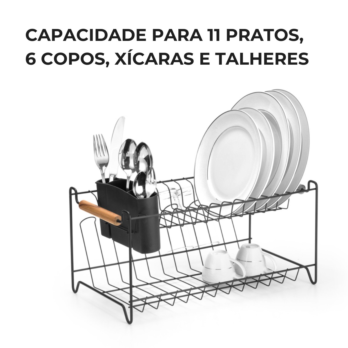 Capacidade Ampla: Com espaço para até 11 pratos e 6 copos, o escorredor duplo permite secar uma grande quantidade de louça de maneira organizada e eficiente, ideal para o dia a dia ou após refeições em família.