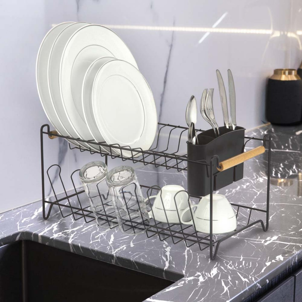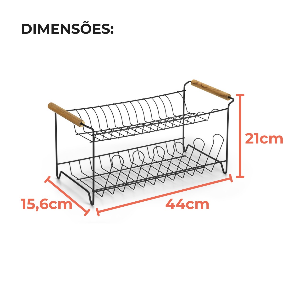 Design Duplo e Compacto: Com dois níveis, o escorredor maximiza o espaço vertical da pia, organizando pratos e copos de maneira eficiente sem ocupar muito espaço na bancada.