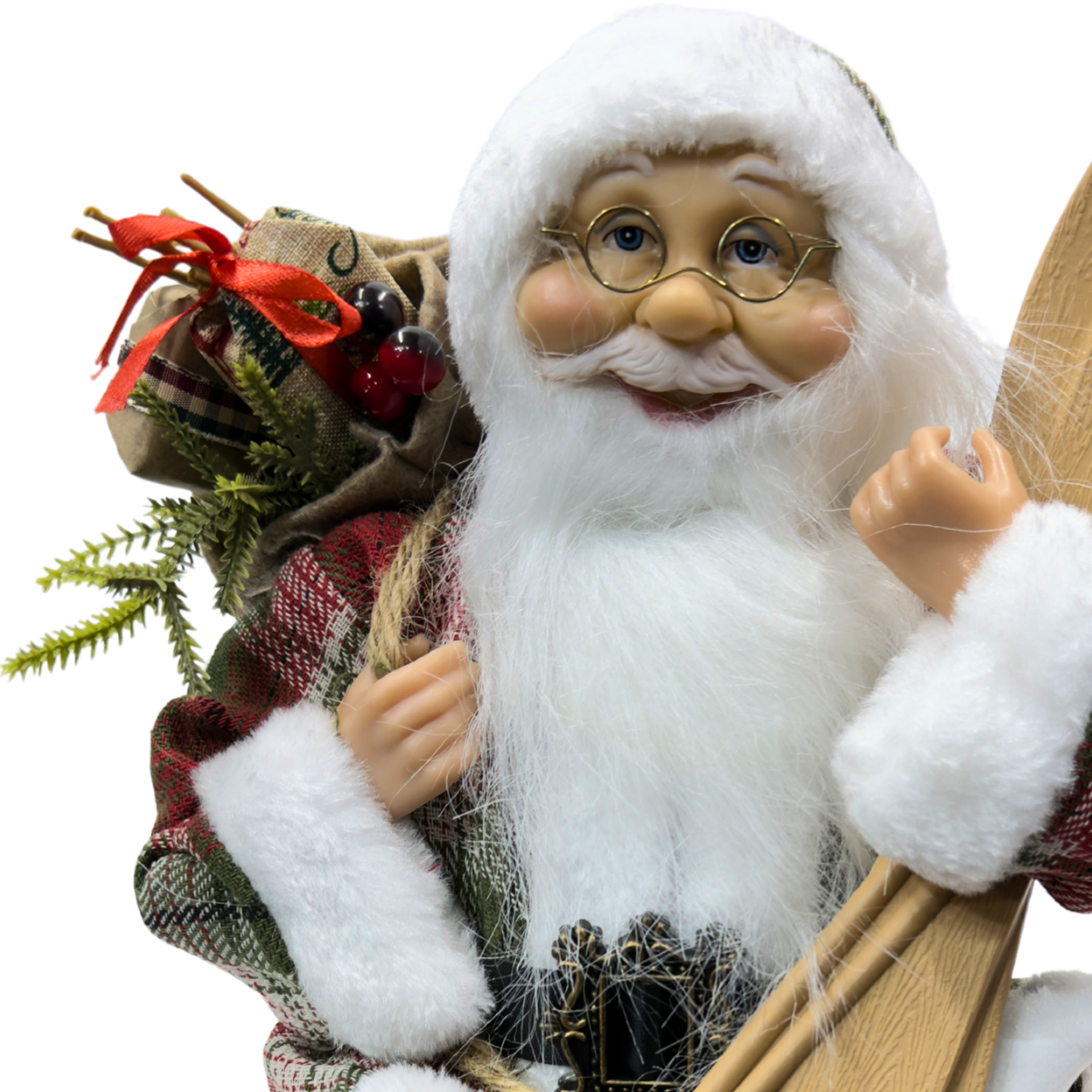O boneco apresenta detalhes cuidadosamente elaborados: barba branca fofa, óculos dourados, roupas em tecido xadrez com acabamento em pelúcia e botas pretas clássicas. Ele carrega em suas mãos um conjunto de esquis decorativos e nas costas uma mochila rústica com ramos, frutas vermelhas e laço de tecido, remetendo ao estilo tradicional e artesanal do Natal.
