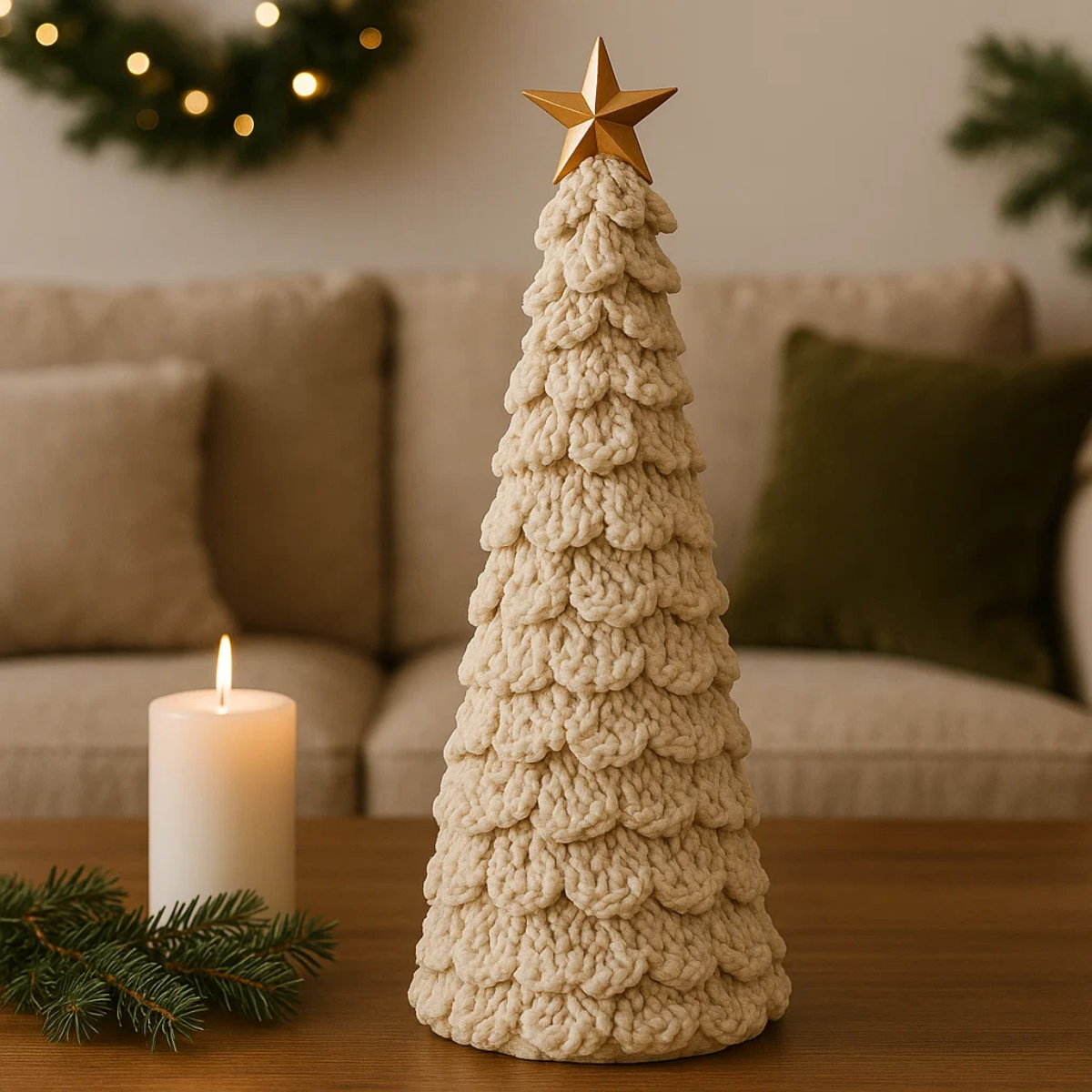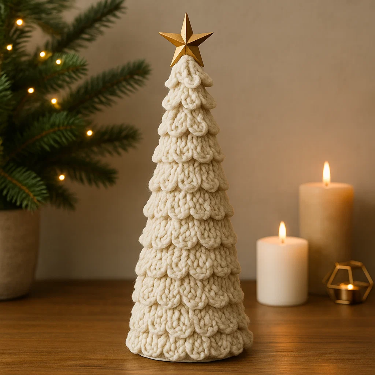 Dica de Decoração: Combine com guirlandas neutras, velas douradas e laços de juta para criar uma atmosfera de Natal sofisticado e natural. Coloque-a sobre bases de madeira ou em conjunto com outras árvores de tamanhos diferentes para composições harmônicas.