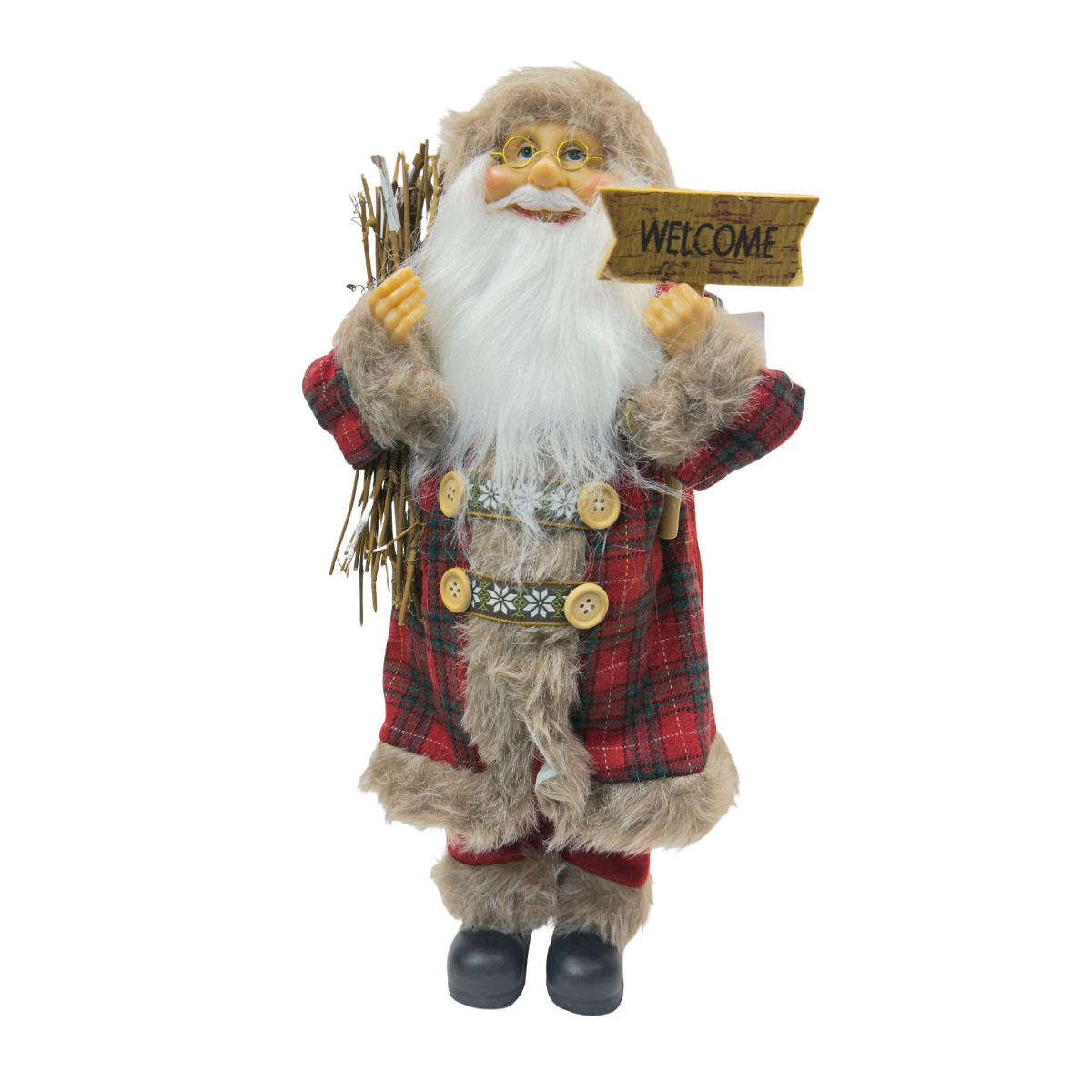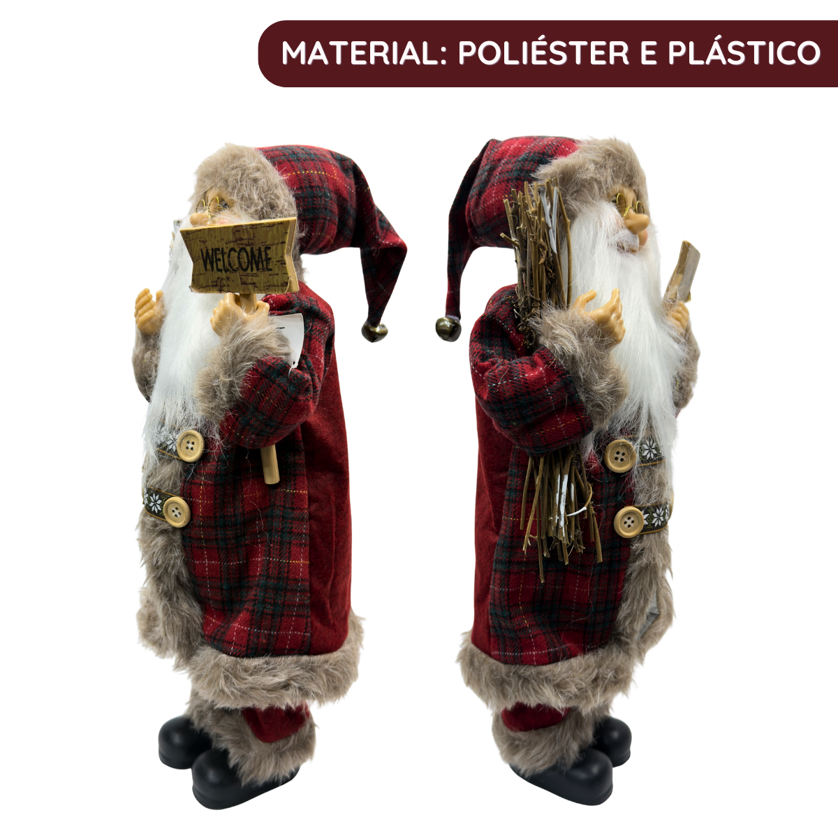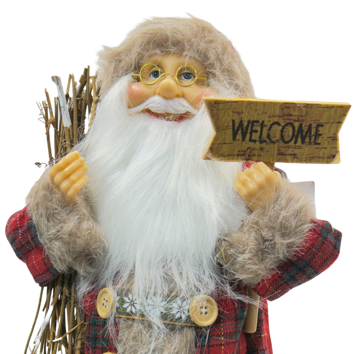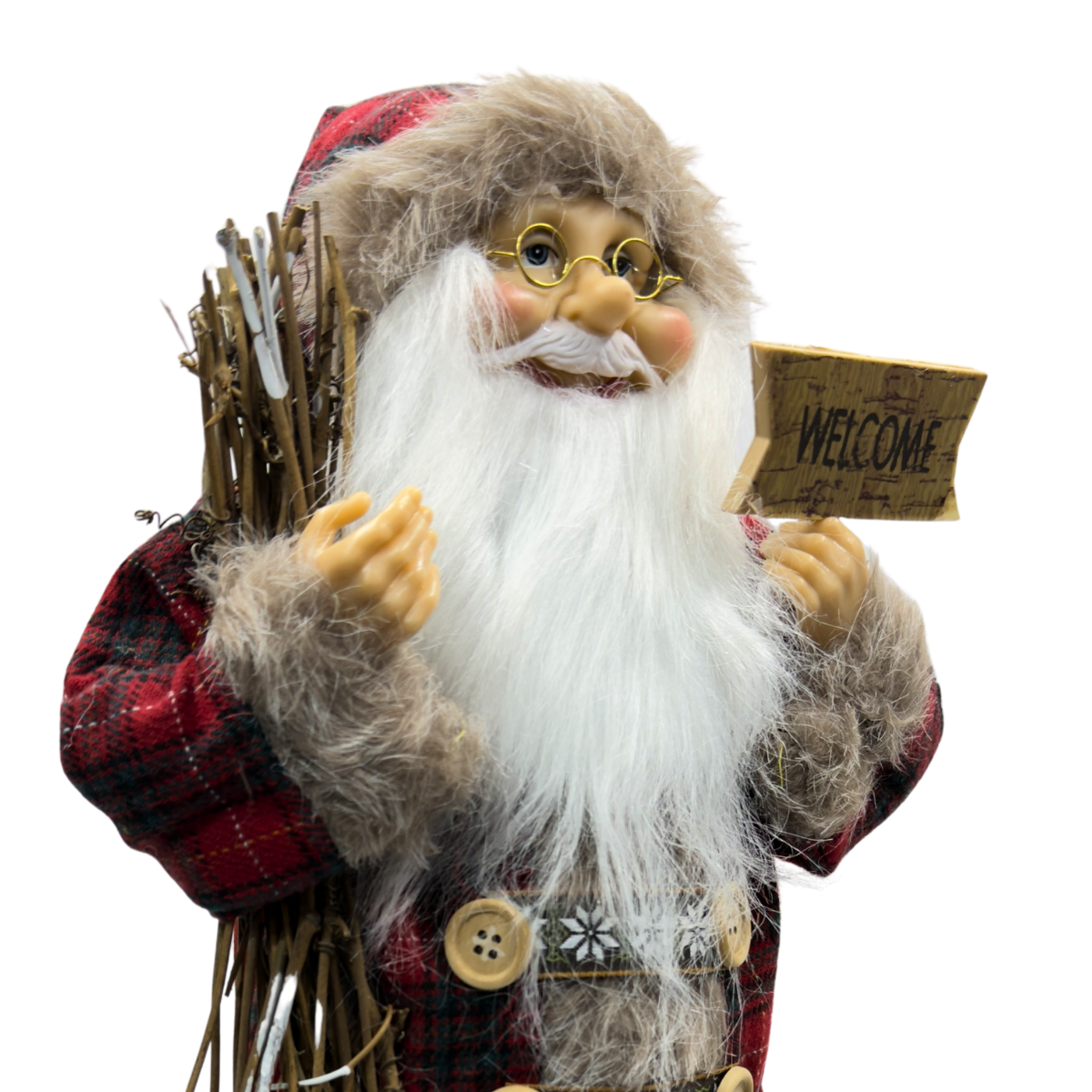 O Papai Noel veste um casaco em tecido xadrez vermelho, trazendo um visual rústico e aconchegante. Em uma das mãos, segura uma placa de madeira com a palavra Welcome, enquanto nas costas carrega um feixe de galhos, reforçando o clima natalino tradicional e acolhedor.