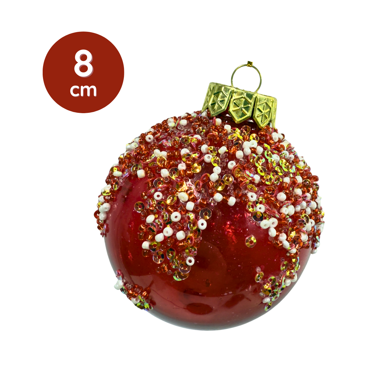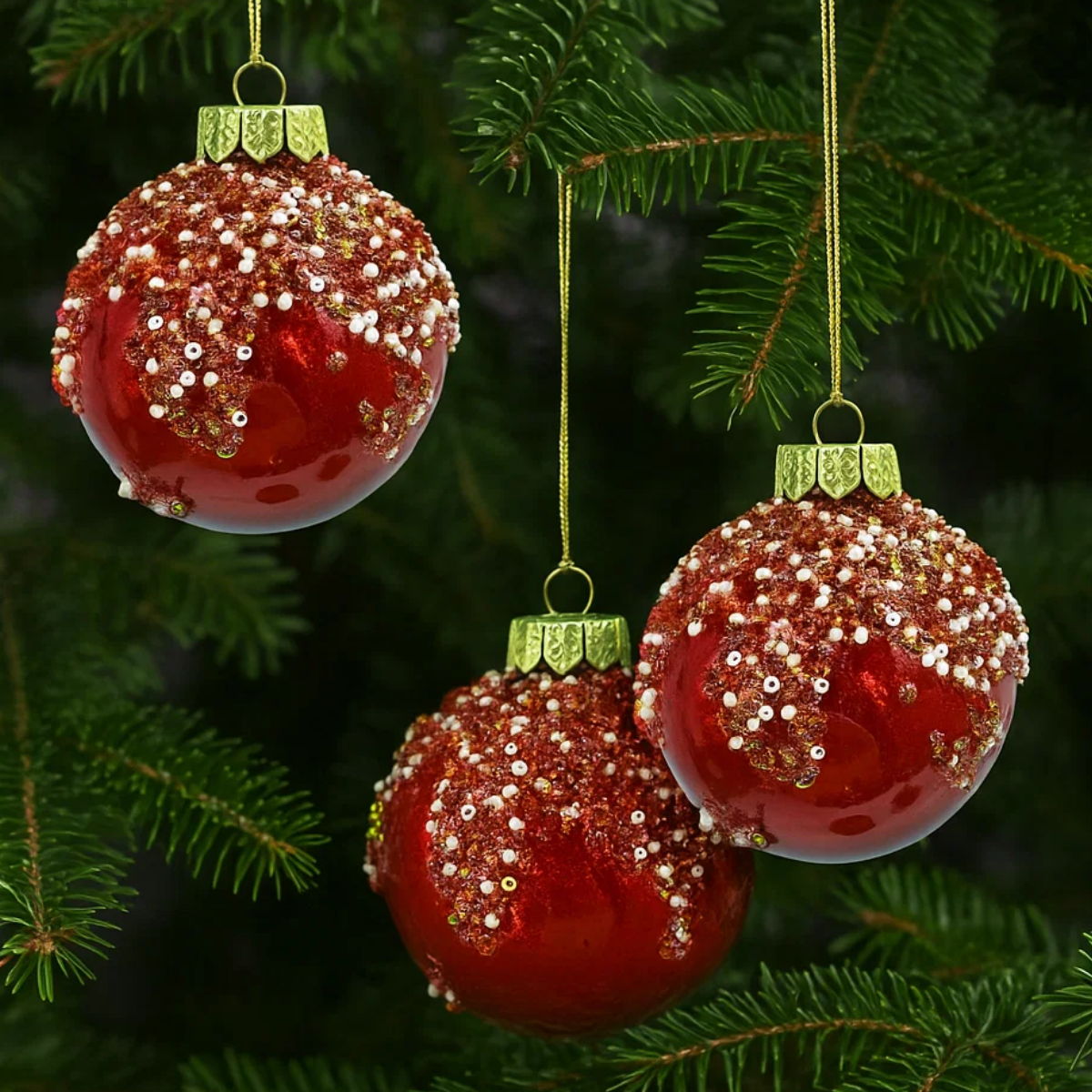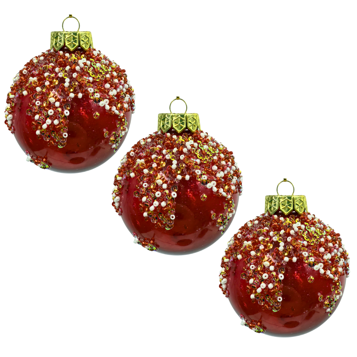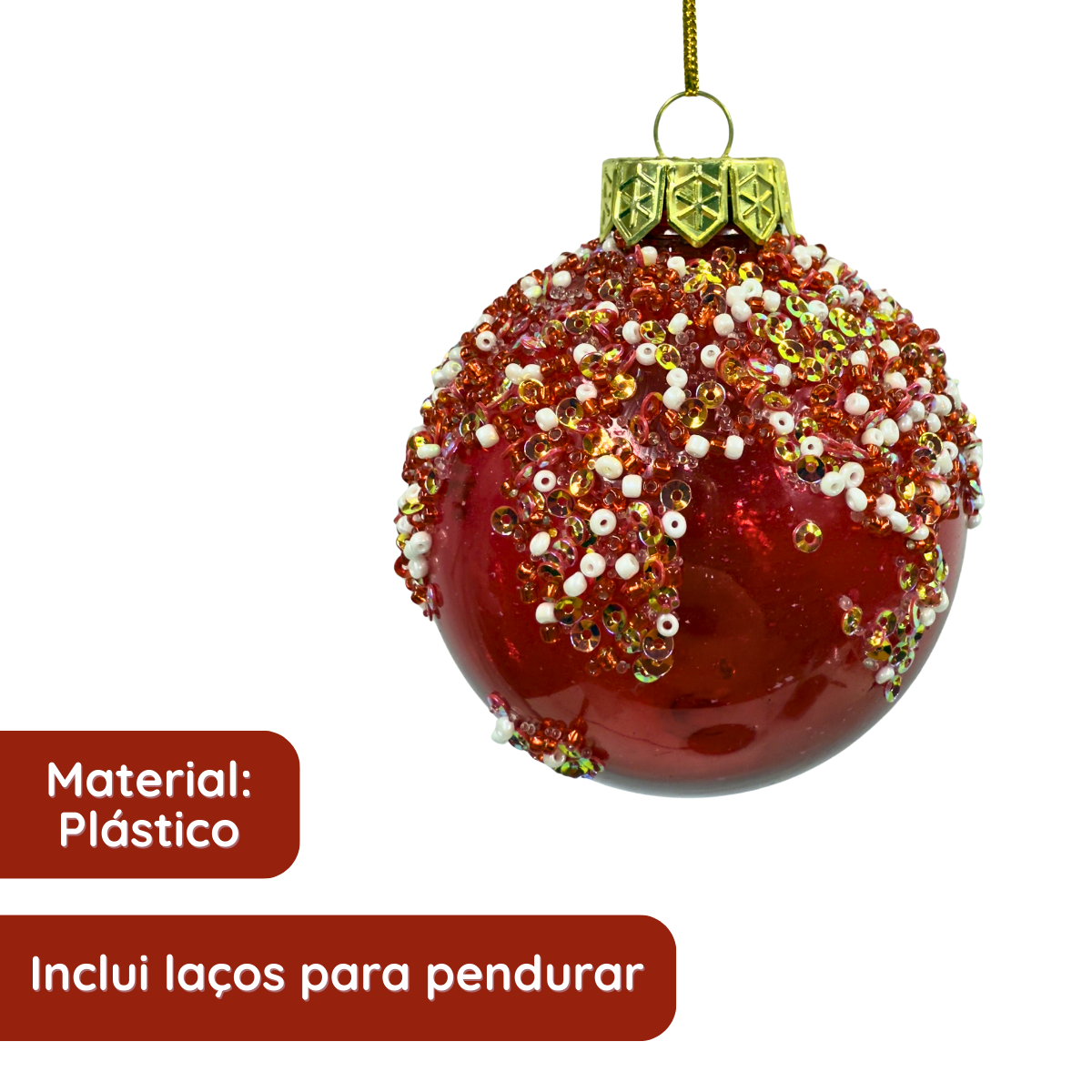 Kit 3 Bolas de Natal Vermelhas Transparentes com Paetês e Miçangas - 8cm