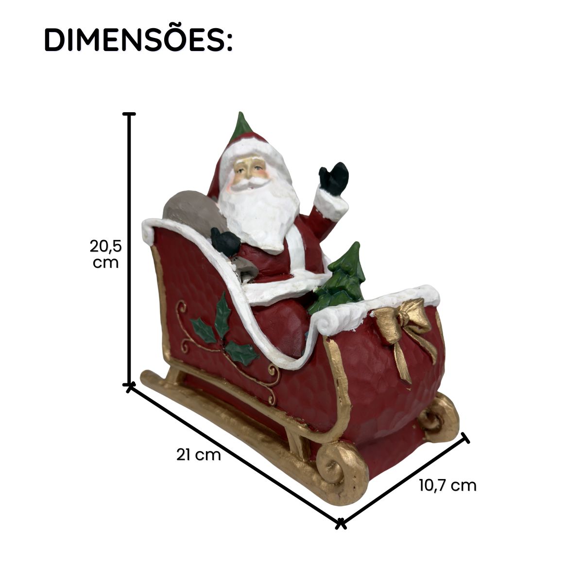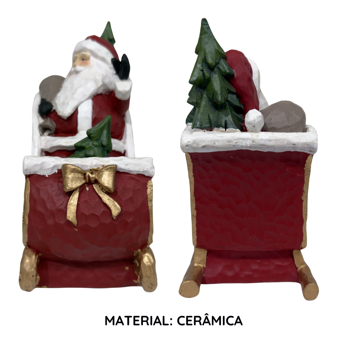 Encante sua casa neste Natal com este lindo enfeite de cerâmica do Papai Noel no trenó. Rico em detalhes, ele traz o bom velhinho com seu tradicional traje vermelho, carregando presentes e uma árvore de Natal, em um trenó decorado com laços dourados e detalhes festivos. Feito em cerâmica de alta qualidade, o item possui pintura artesanal em cores vivas, que destacam cada detalhe da peça. Ideal para ser usado em aparadores, mesas decorativas, prateleiras ou até como peça central na sala, tornando sua decoração natalina ainda mais acolhedora e charmosa.