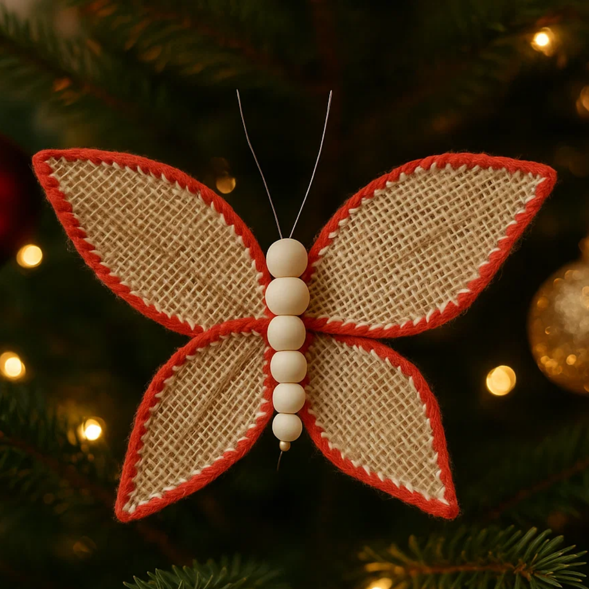 A Borboleta de Natal Rústica Bege com Vermelho é um detalhe encantador que traz leveza e um toque artesanal à decoração natalina. Seu design delicado, com asas em tecido tramado e bordas vermelhas, combina perfeitamente com o estilo rústico e natural do Natal tradicional.