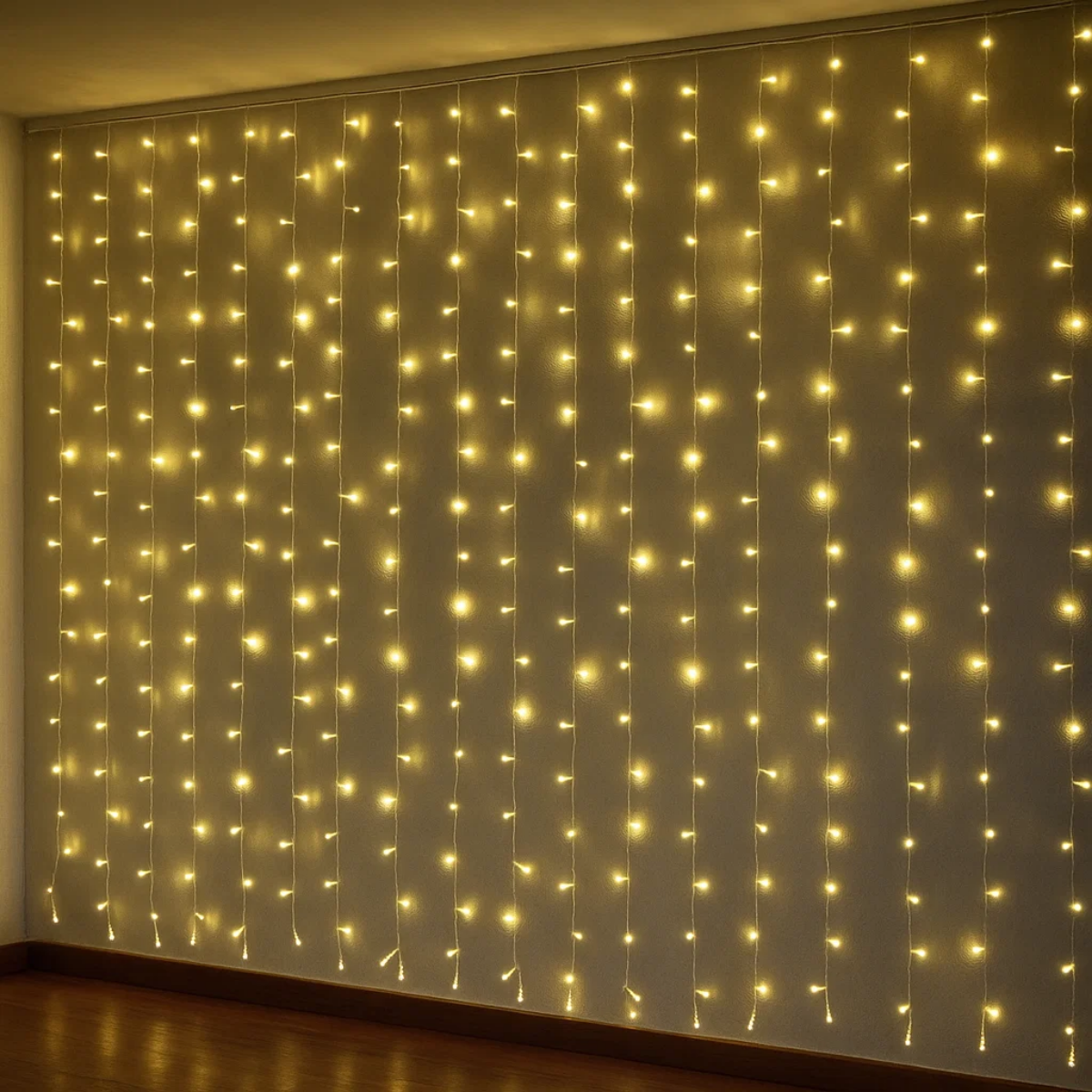 Decoração sofisticada: Perfeita para fachadas residenciais, festas e eventos, a cortina de LEDs cria um efeito de queda de luz encantador, combinando brilho e elegância. Use em conjunto com pisca-piscas e enfeites dourados ou neutros para um visual ainda mais harmonioso.