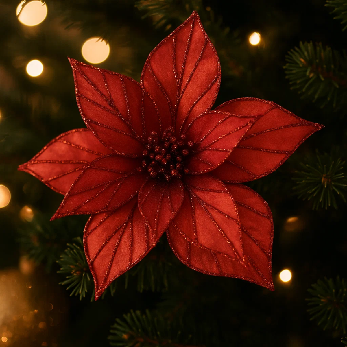 Dica de Decoração: Combine essa flor com fitas douradas, bolas clássicas e luzes quentes para montar uma árvore encantadora e cheia de vida. Uma peça indispensável para um Natal clássico, cheio de brilho e emoção.