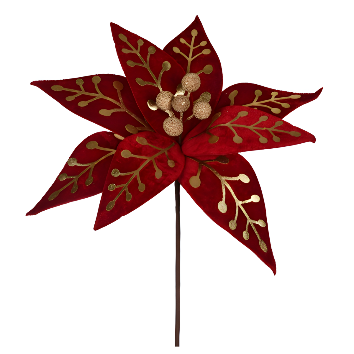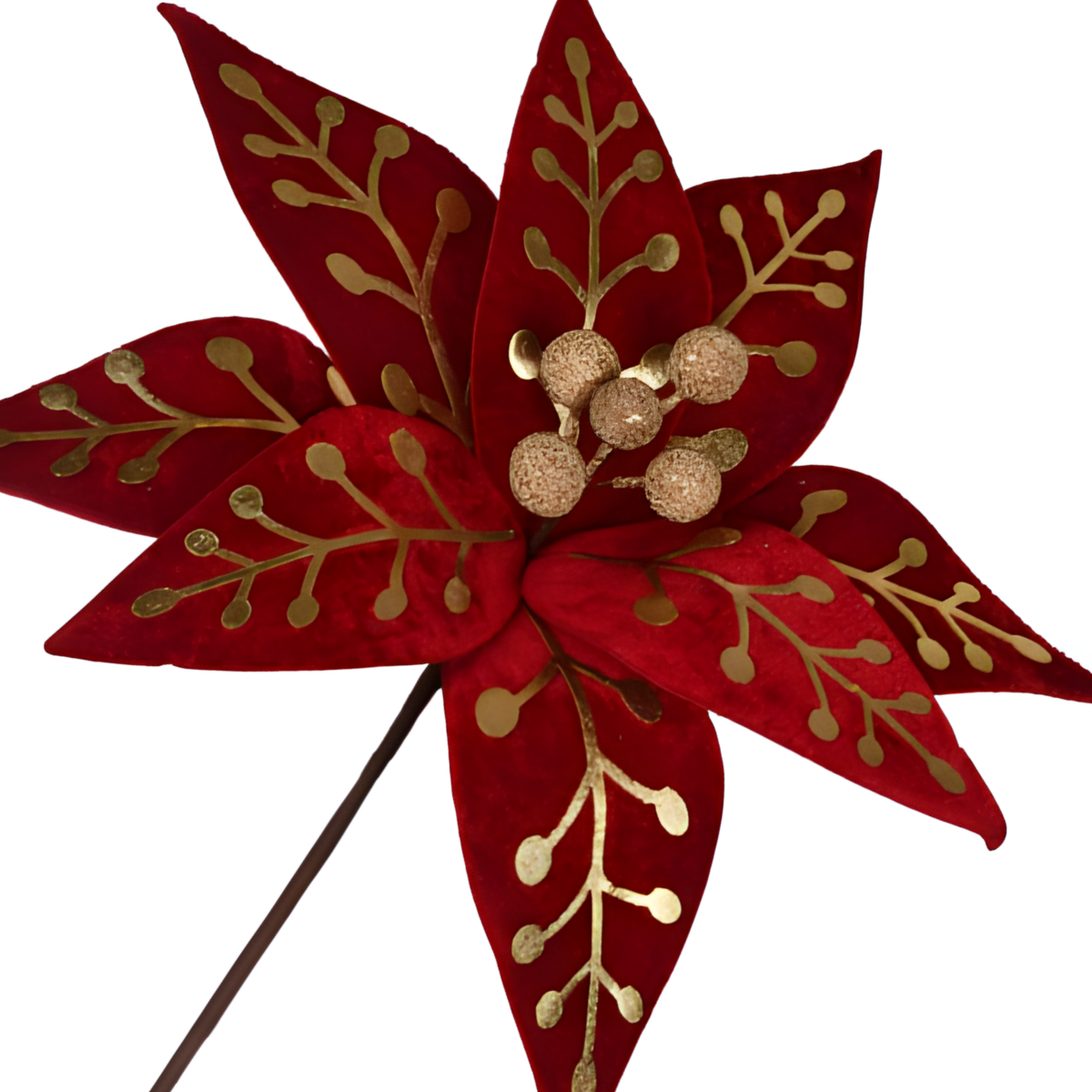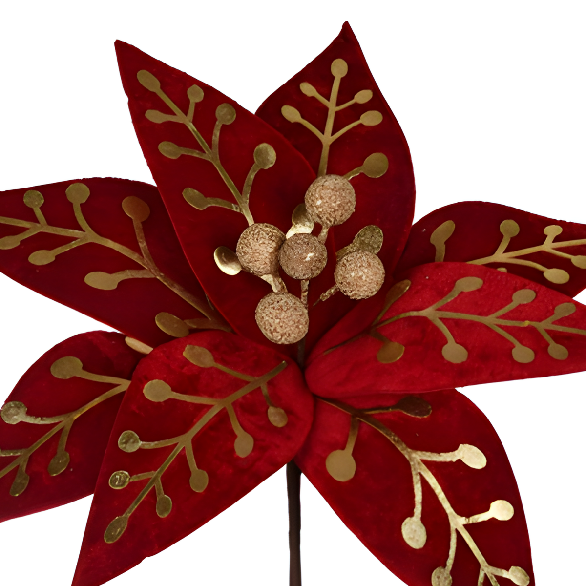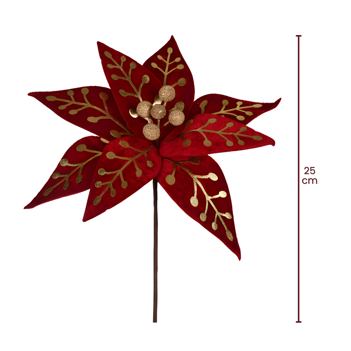 A Poinsétia Natalina, também conhecida como Bico de Papagaio, é um ícone da decoração de Natal, e nesta versão aveludada com detalhes dourados ela se torna ainda mais elegante e sofisticada. Com pétalas estruturadas, arabescos dourados e miolo com esferas decorativas, esta flor transforma árvores, guirlandas e arranjos com um toque clássico e luxuoso.