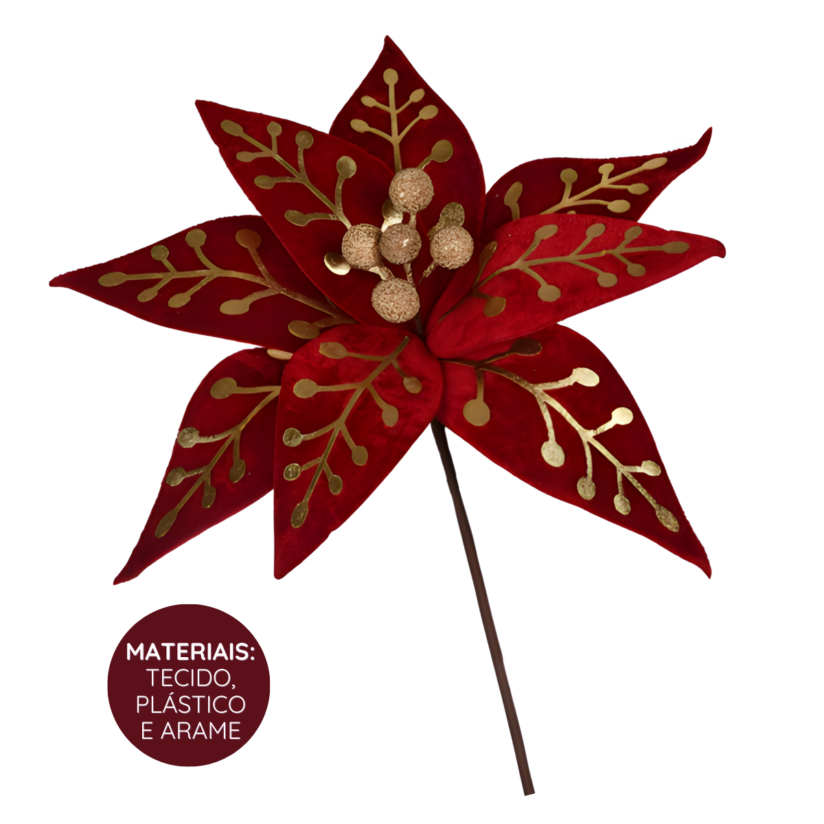 Poinsétia Natalina Aveludada Vermelha e Dourada 25 cm