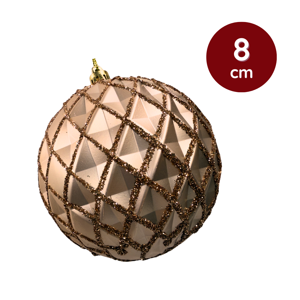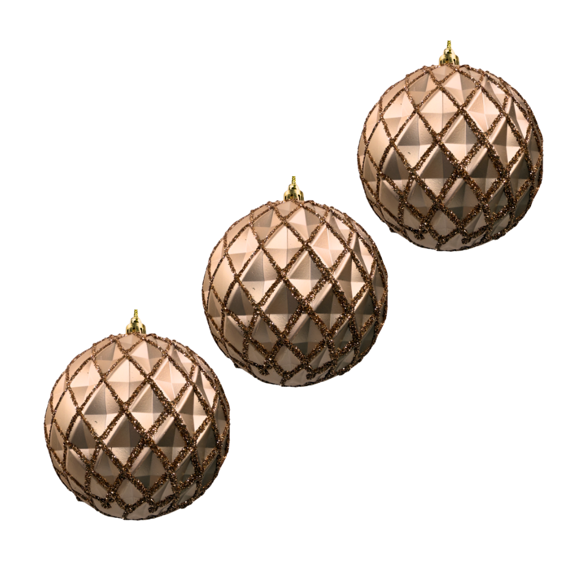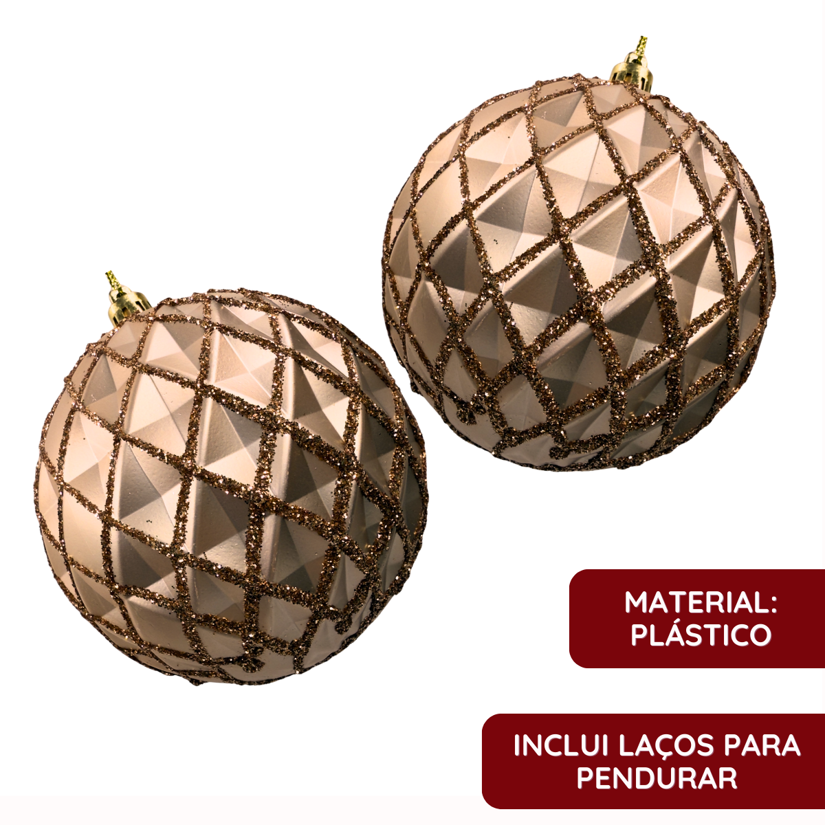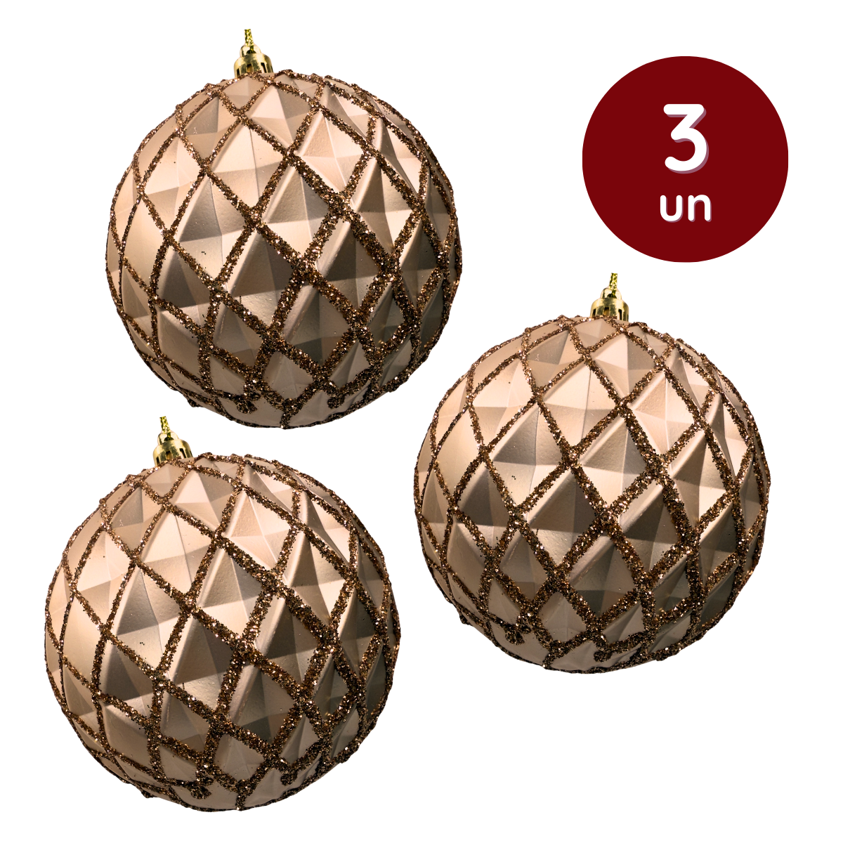 Charmosas e sofisticadas, as Bolas de Natal em tom rose trazem um brilho especial para qualquer decoração natalina. Com textura geométrica e acabamento em glitter, elas adicionam elegância ao ambiente e se destacam na árvore, guirlanda ou arranjos.