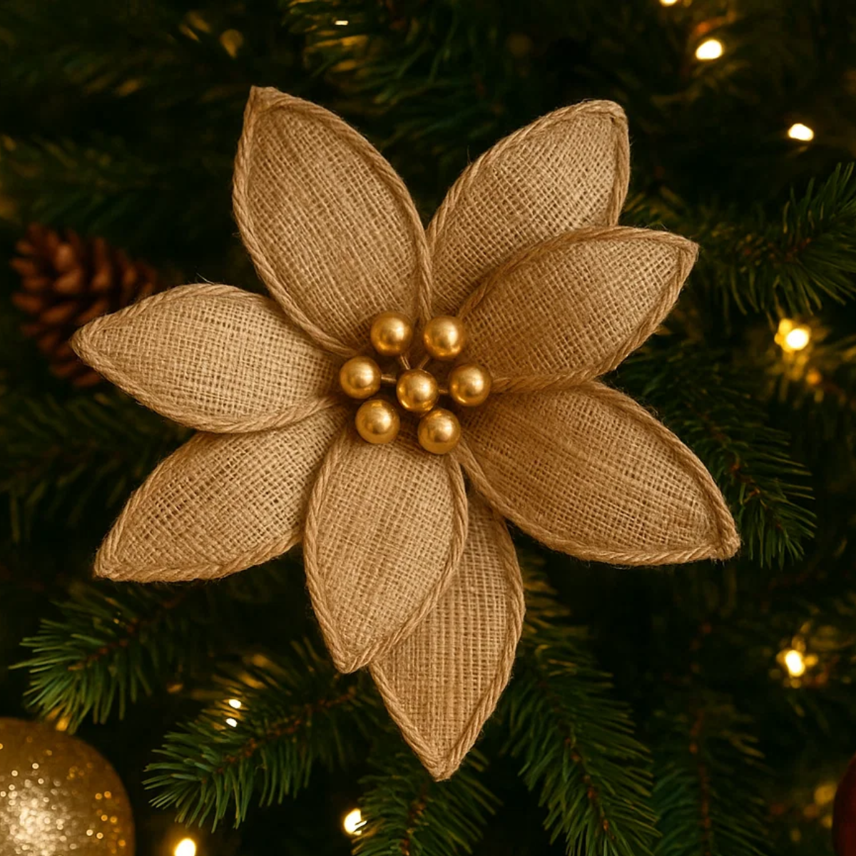 Uso Ideal: Perfeita para decorar árvores de Natal, guirlandas, arranjos e vasos, a flor Poinsétia em juta é uma opção elegante e acolhedora. Seu acabamento natural valoriza composições com tons terrosos, dourados e verdes.