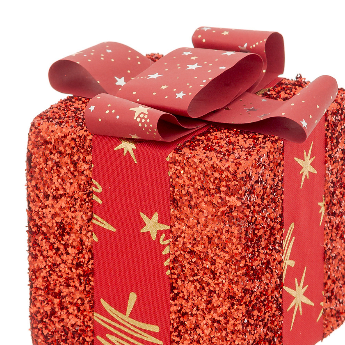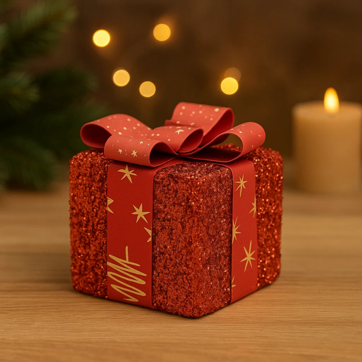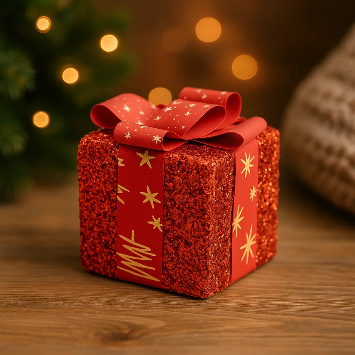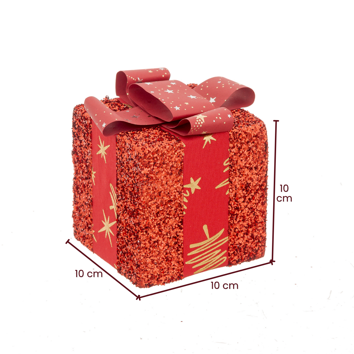 Presente Decorativo Vermelho com Glitter e Laço Estampado 10cm – Brilho Clássico e Elegância Natalina