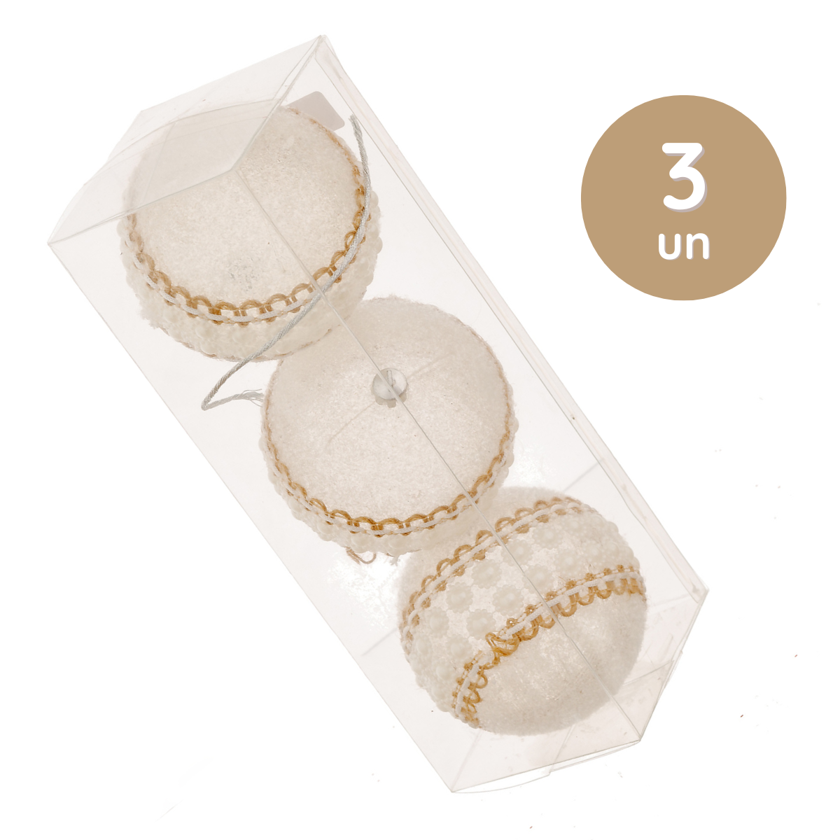 Kit 3 Bolas Natalinas 8cm – Cravejada com Bordado Branco e Dourado
