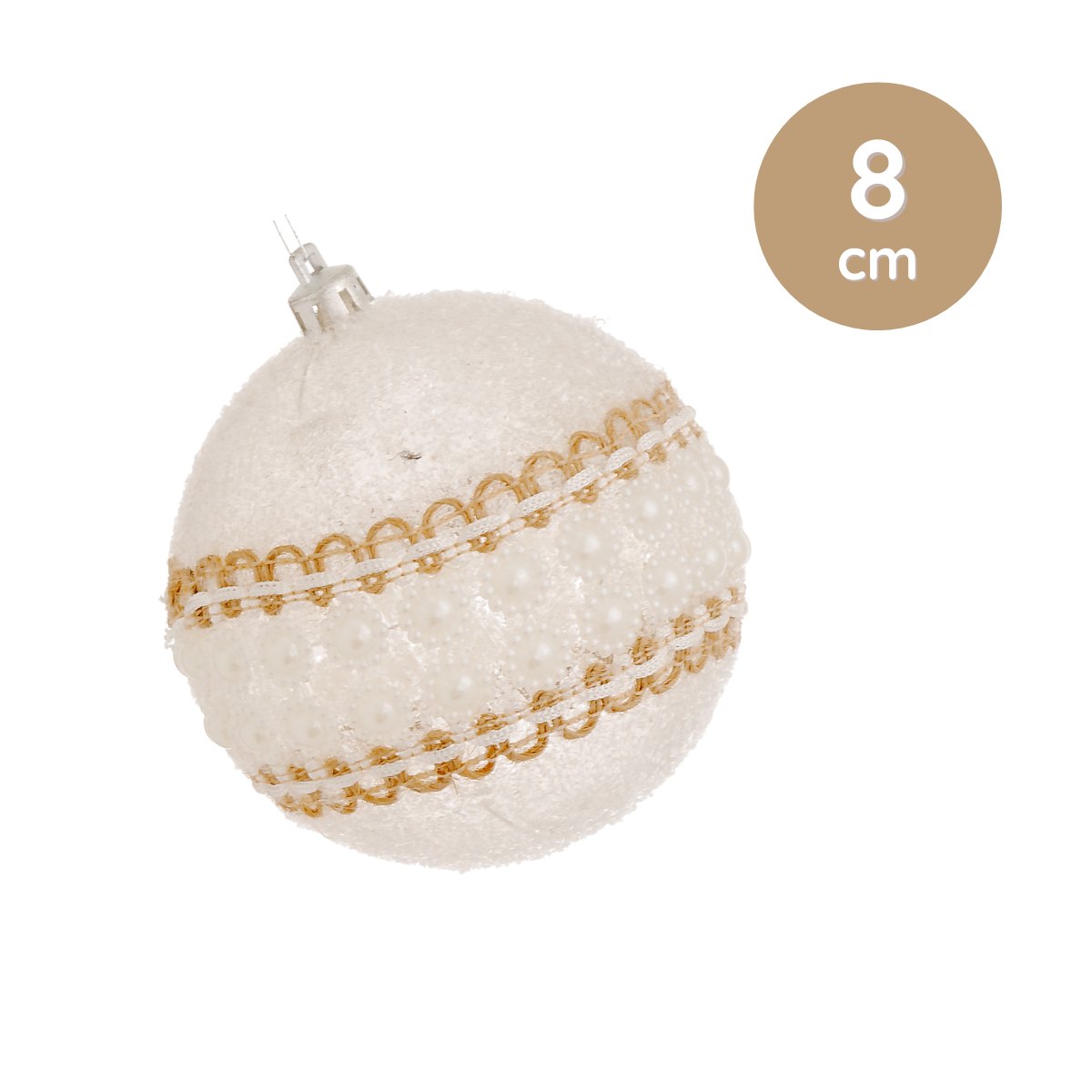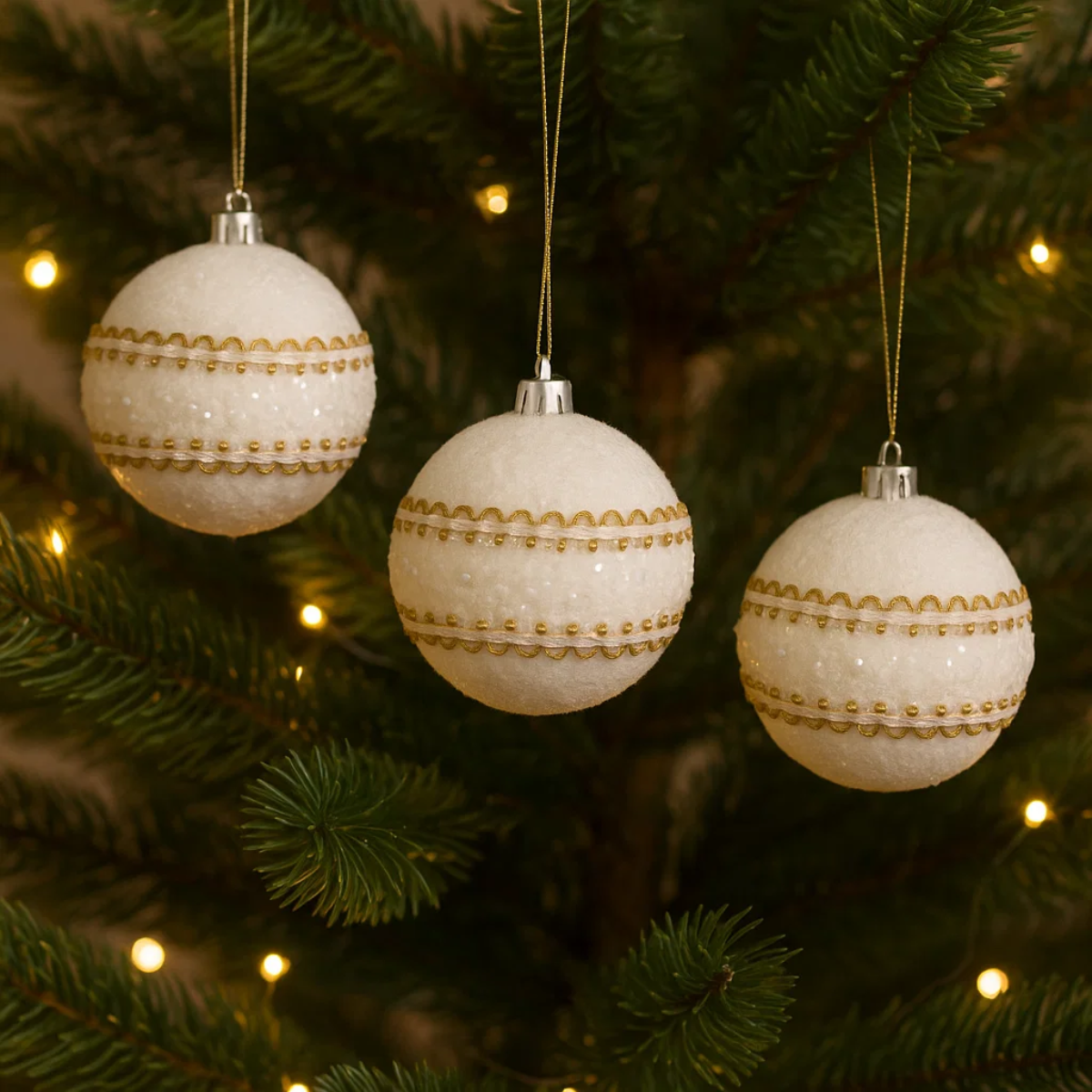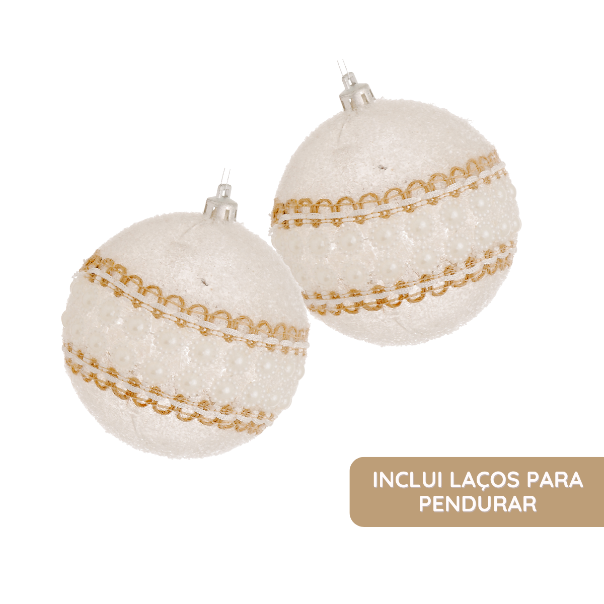 Delicadas e sofisticadas, as Bolas Cravejadas com Bordado Branco e Dourado são a escolha perfeita para quem deseja uma decoração elegante e iluminada. O acabamento cravejado e o bordado dourado adicionam brilho sutil e um toque de luxo à sua árvore de Natal.