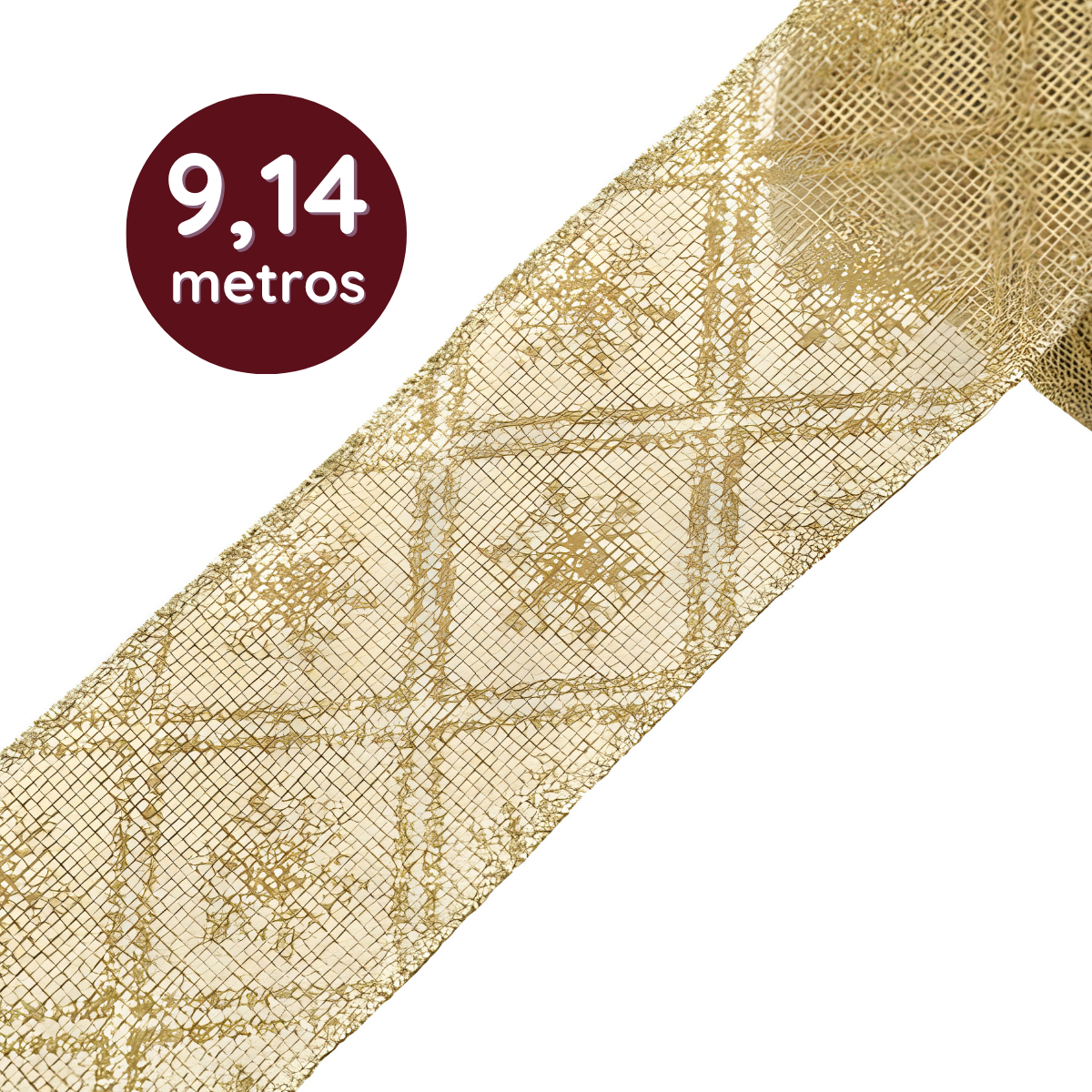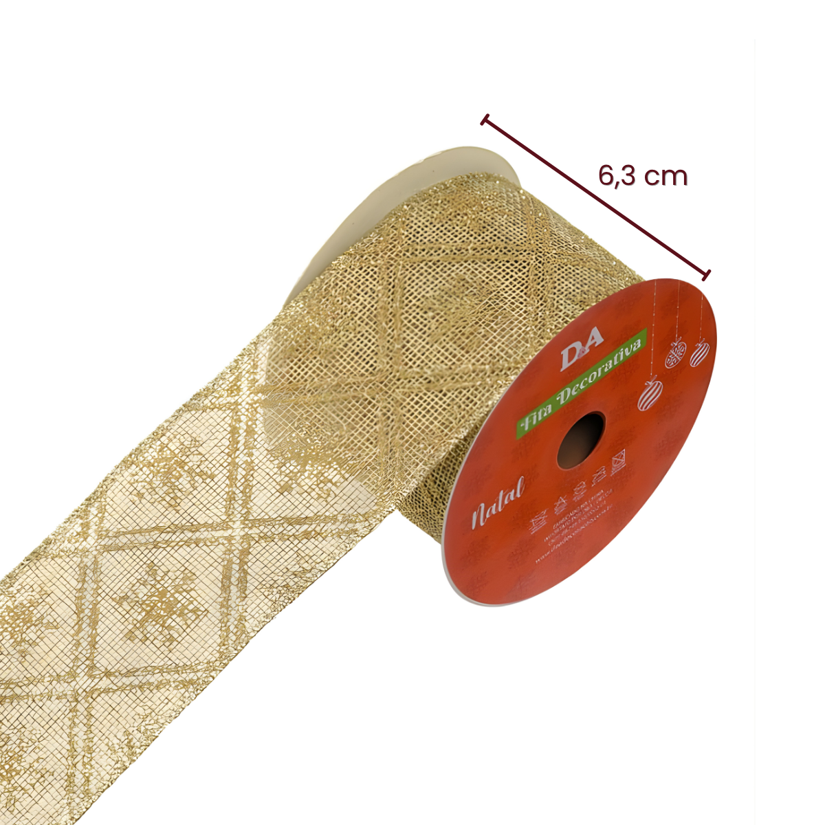 Dica de Decoração: Combine esta fita com elementos dourados, folhagens verdes e luzes quentes para criar arranjos acolhedores e elegantes. O brilho champanhe traz delicadeza e luminosidade na medida certa.