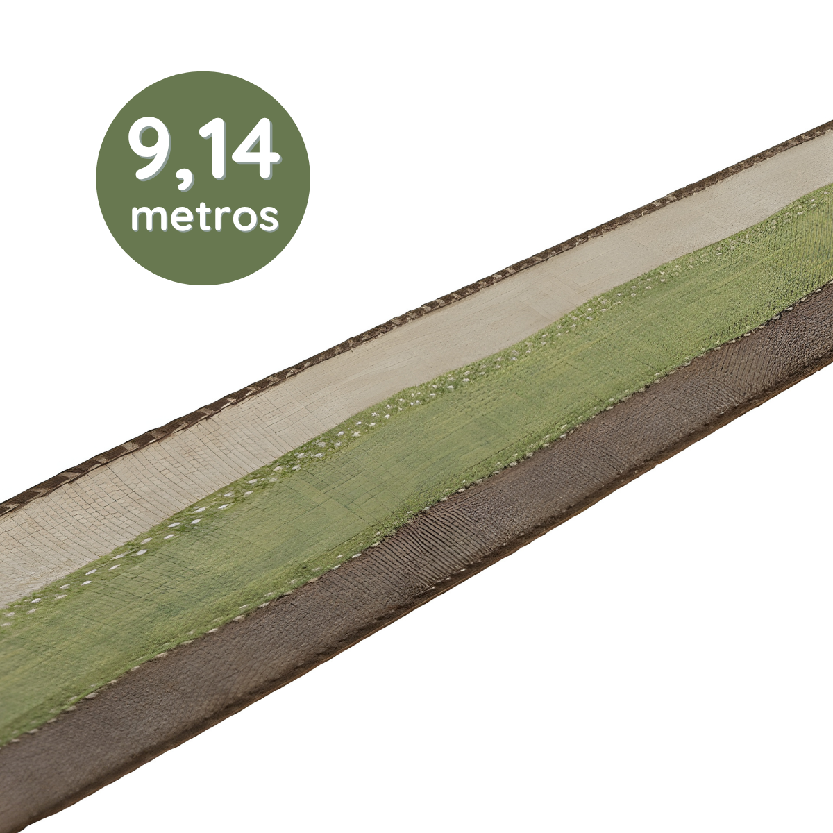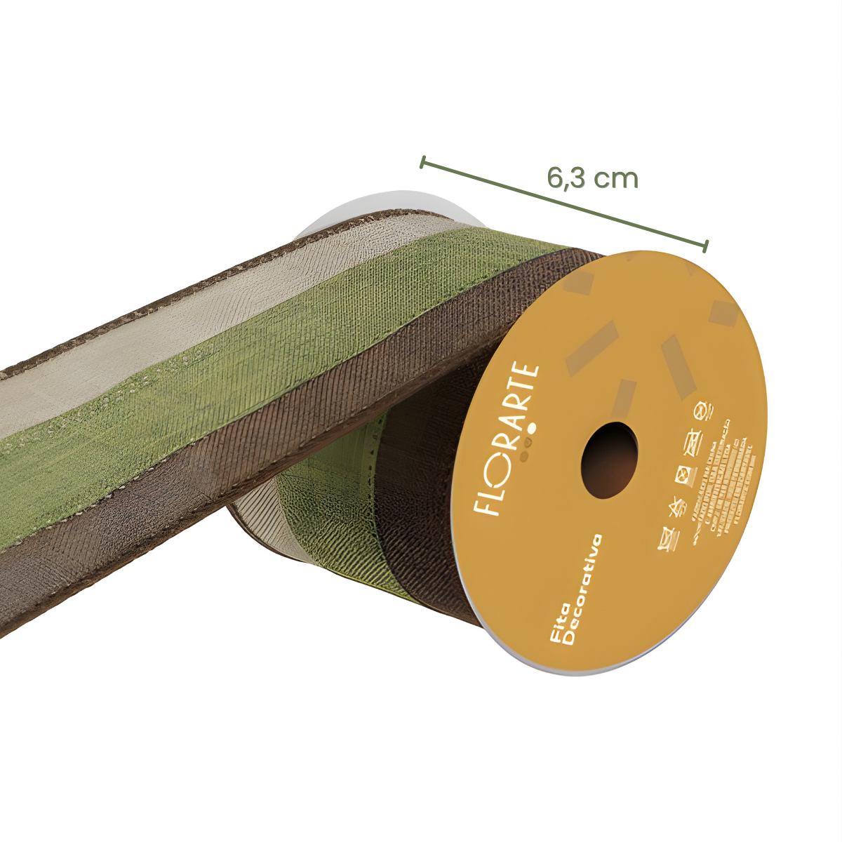 Fita Decorativa Aramada Bege e Verde 6,3cm x 9,14m