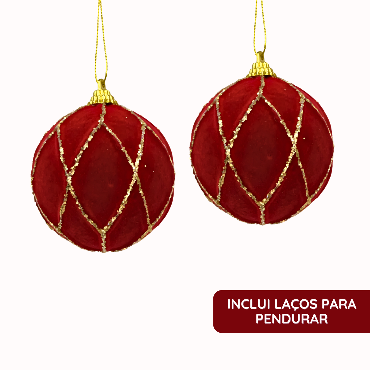 Elegantes e cheias de brilho, as Bolas Natalinas Vinho 8cm são perfeitas para quem deseja uma decoração sofisticada, clássica e marcante. Com acabamento aveludado e desenhos geométricos dourados em glitter, elas adicionam profundidade, textura e luminosidade à sua árvore de Natal.