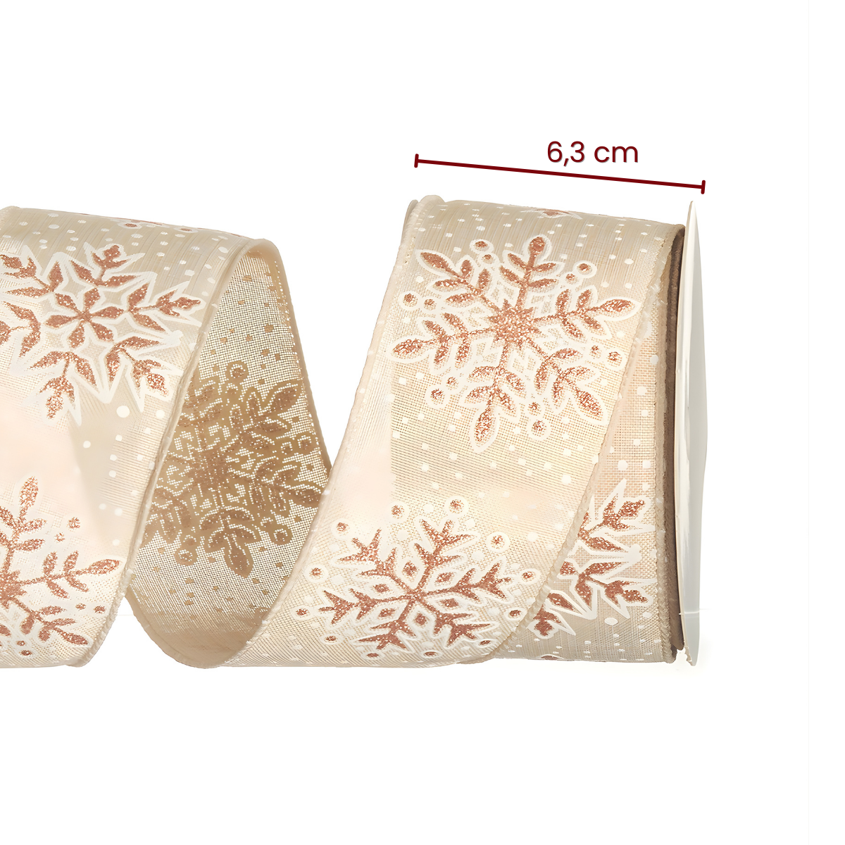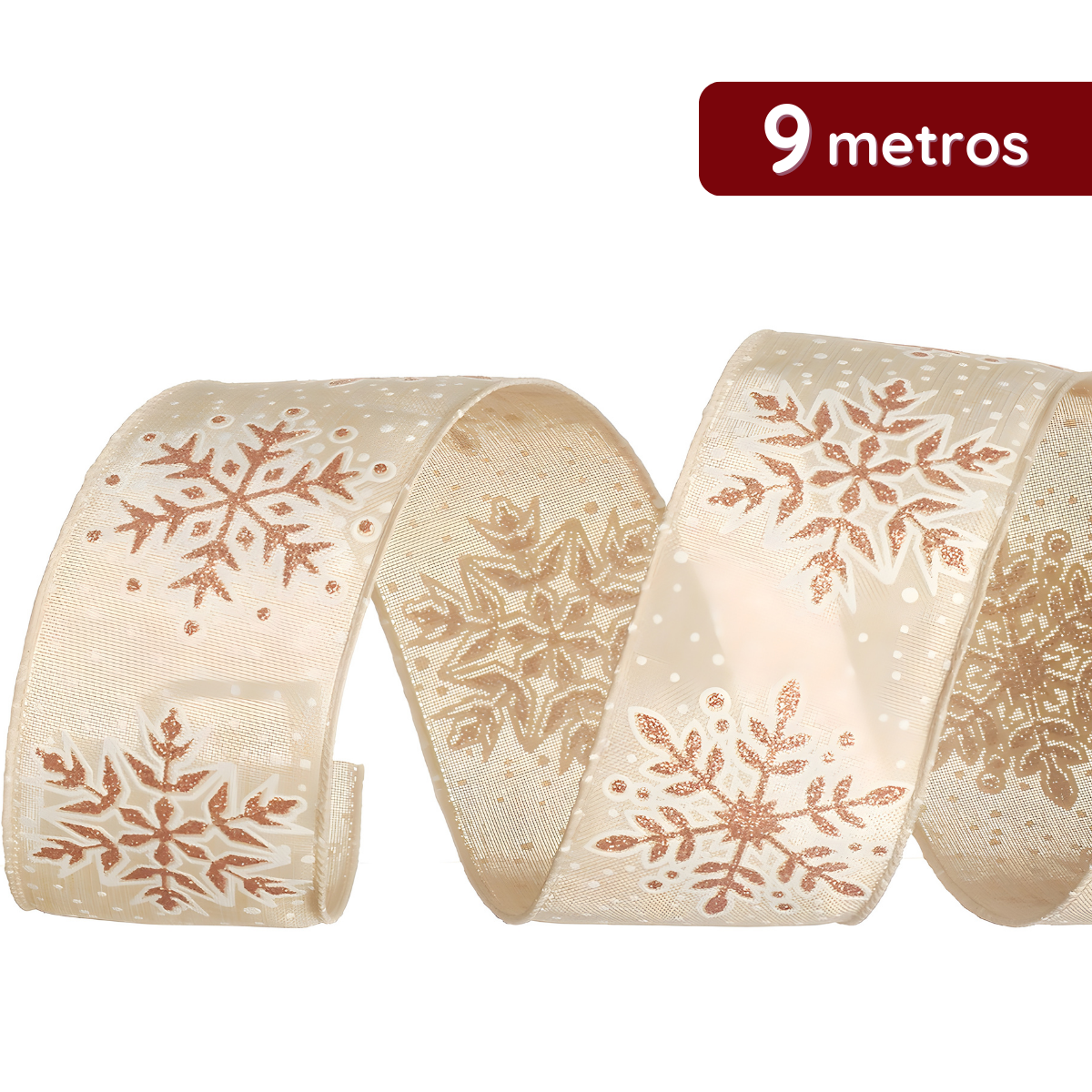 Seu design apresenta flocos de neve detalhados em glitter rose gold, aplicados sobre um fundo champanhe, que reflete a luz e traz um acabamento luxuoso e atemporal. A fita possui bordas aramadas, permitindo modelar laços firmes e estruturados.