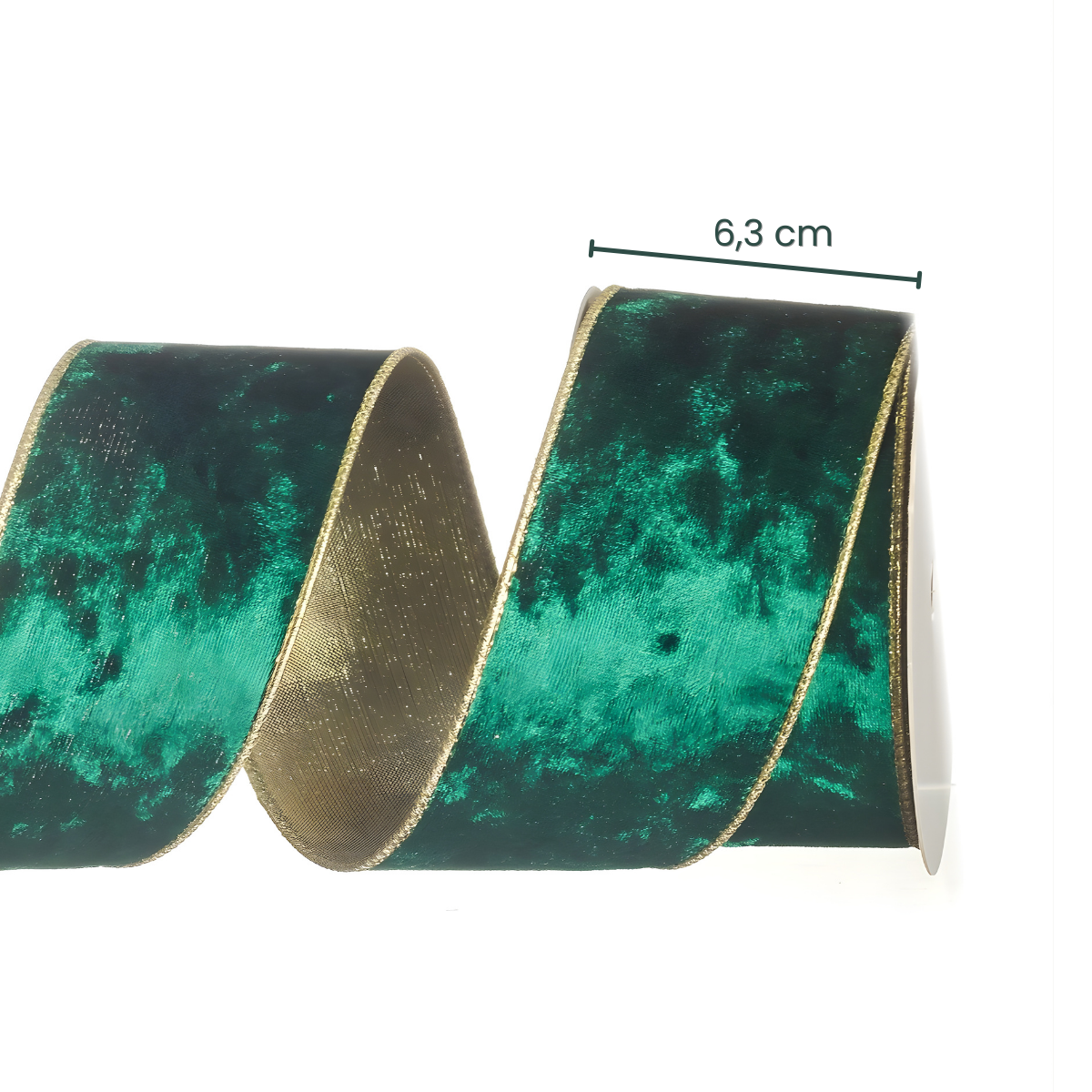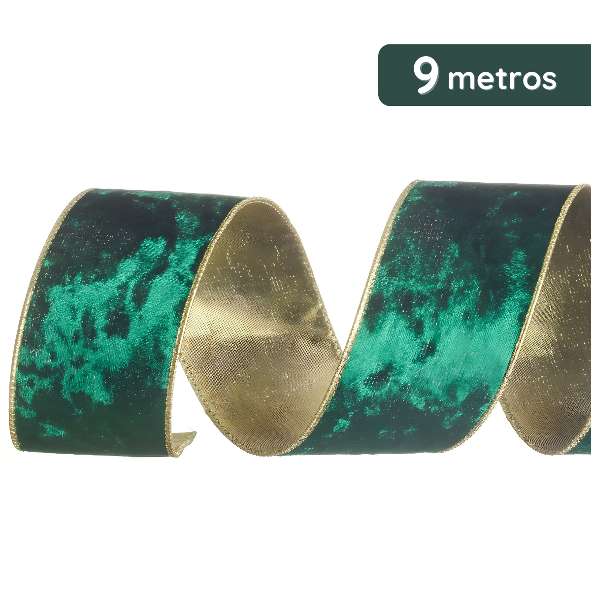 A Fita Veluda Verde Escuro é perfeita para quem busca uma decoração natalina elegante, imponente e com visual aveludado. Com 6,3 cm de largura e 9 metros de comprimento, oferece excelente rendimento para laços volumosos, guirlandas, árvores de Natal, arranjos e embalagens especiais. Seu acabamento em veludo verde escuro traz profundidade e rica textura, enquanto o verso dourado e as bordas aramadas garantem firmeza, brilho e total facilidade na modelagem dos laços.