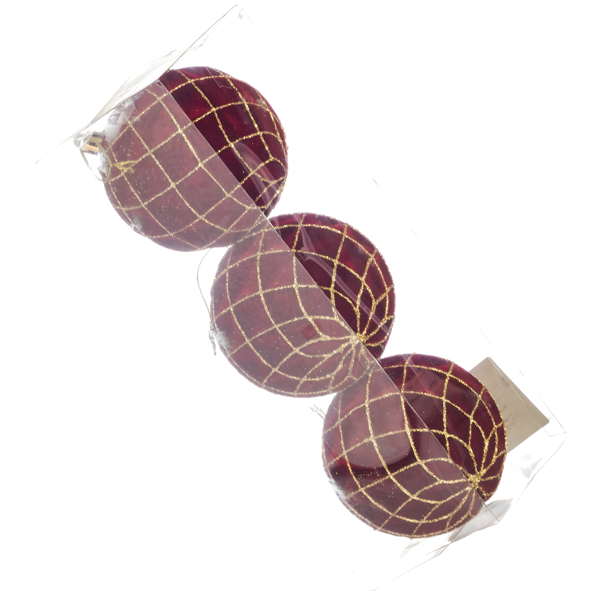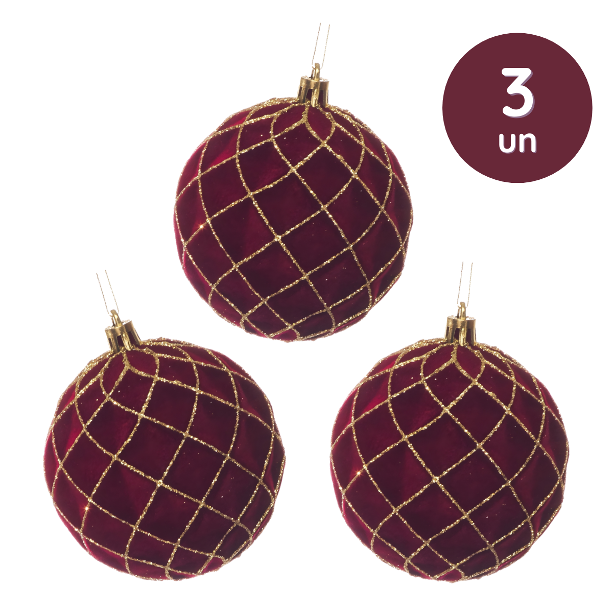 Kit 3 Bolas Natalinas 8cm – Vermelho com Glitter Dourado