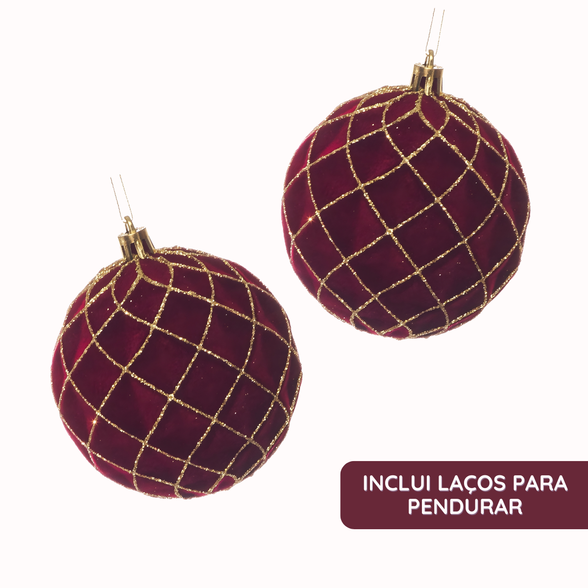 Elegantes e marcantes, as Bolas Natalinas Vermelho 8cm são perfeitas para quem deseja uma decoração clássica com um toque de luxo. O acabamento aveludado, combinado ao desenho geométrico com glitter dourado, cria um efeito sofisticado que ilumina qualquer árvore de Natal.