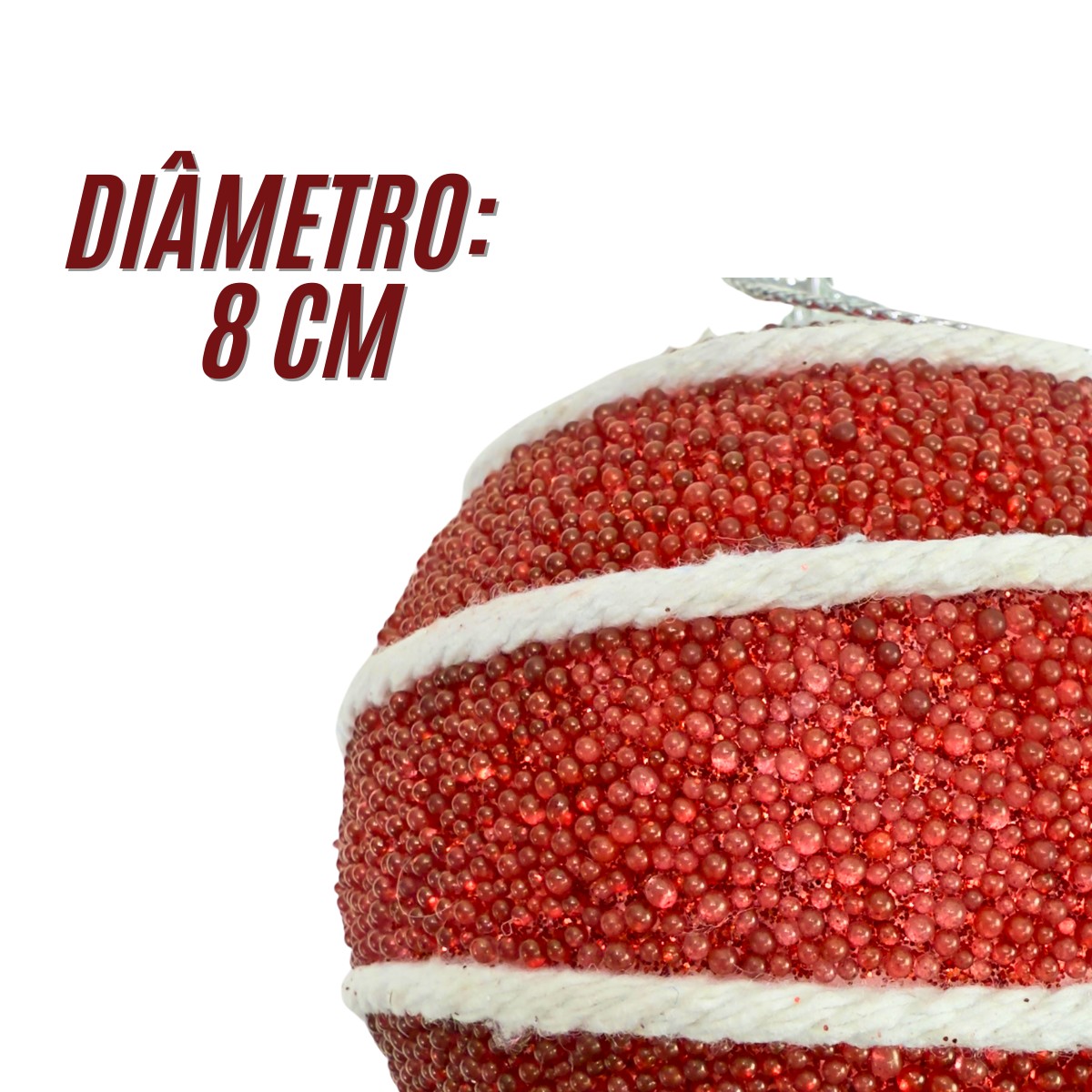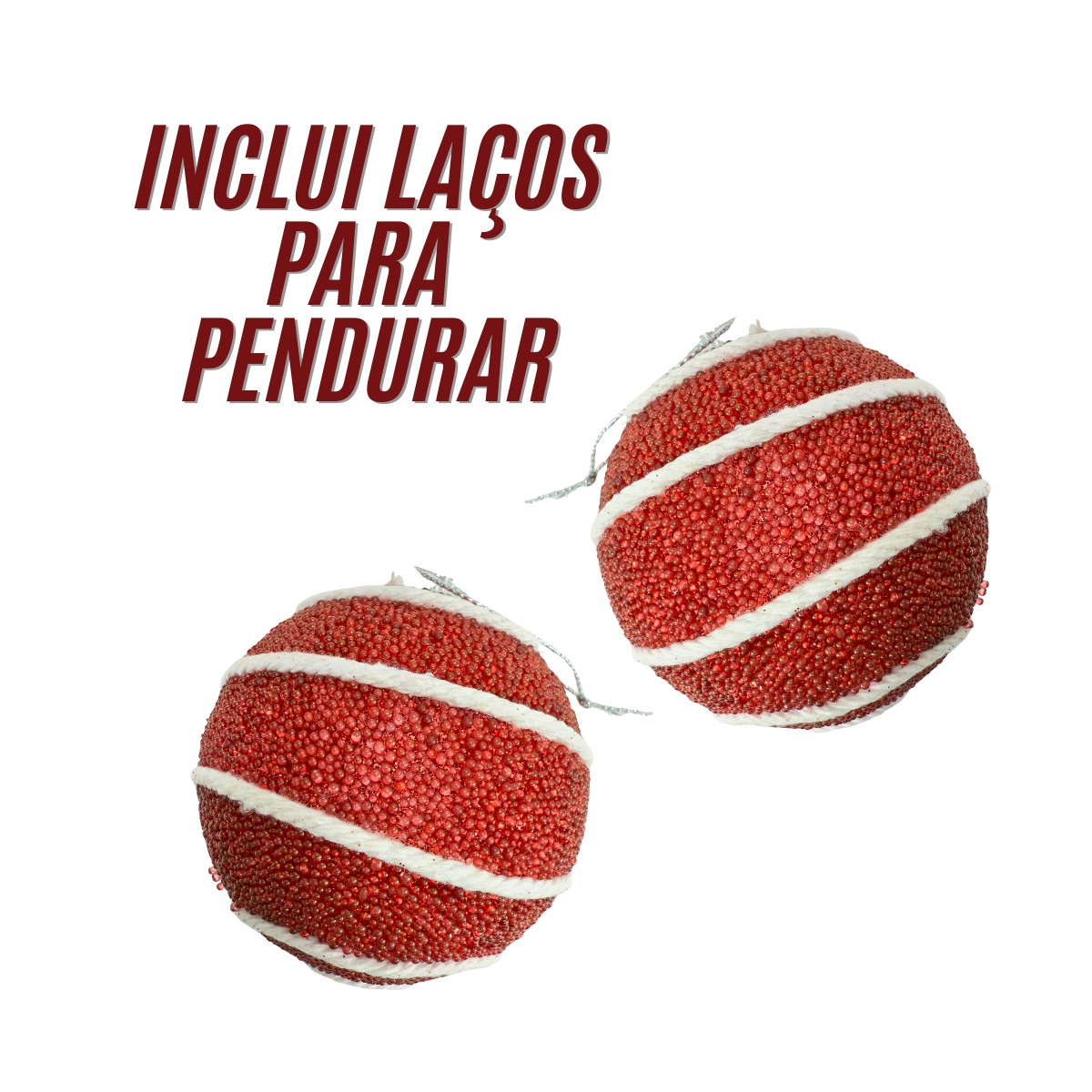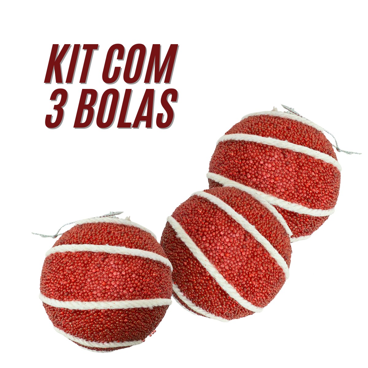 Kit 3 Bolas de Natal Vermelhas com Espirais de Corda Branca 8cm - Enfeite para Árvore