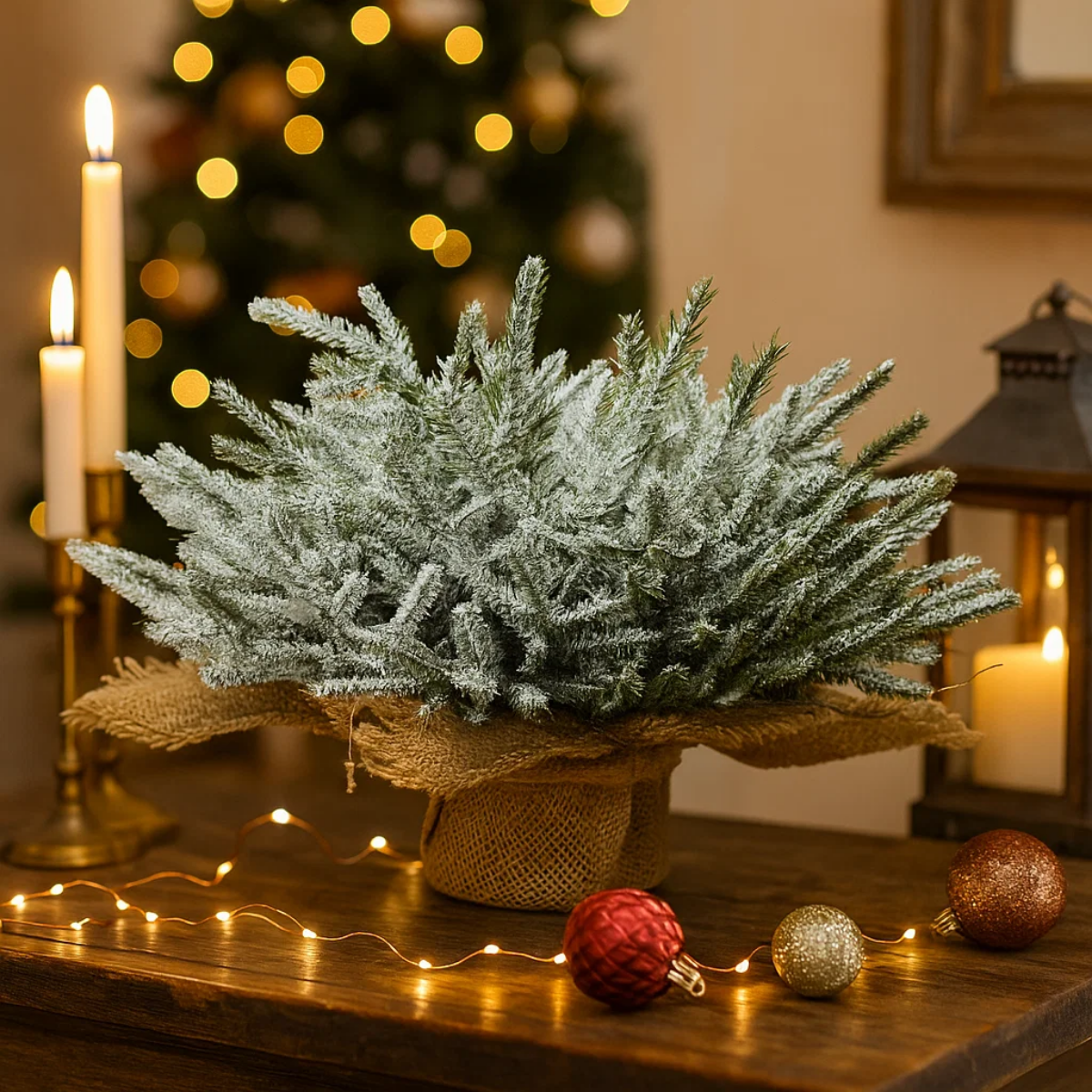 Decoração sofisticada: O pinheiro nevado rasteiro é ideal para criar composições natalinas elegantes e acolhedoras. Combine-o com velas, laços, pinhas ou miniaturas de Natal para realçar ainda mais o brilho das festas.