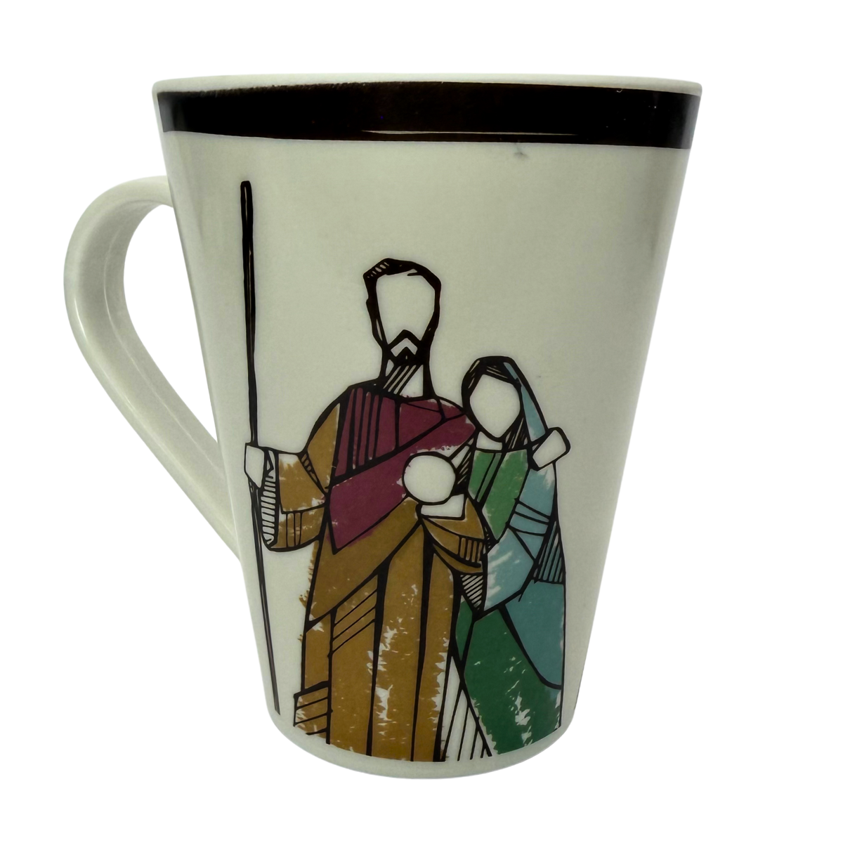 Celebre o verdadeiro espírito do Natal com esta caneca exclusiva da Sagrada Família. Com design artístico em estilo vitral, ela traz uma representação delicada de José, Maria e o Menino Jesus, sendo perfeita para acompanhar seus momentos de fé e confraternização.