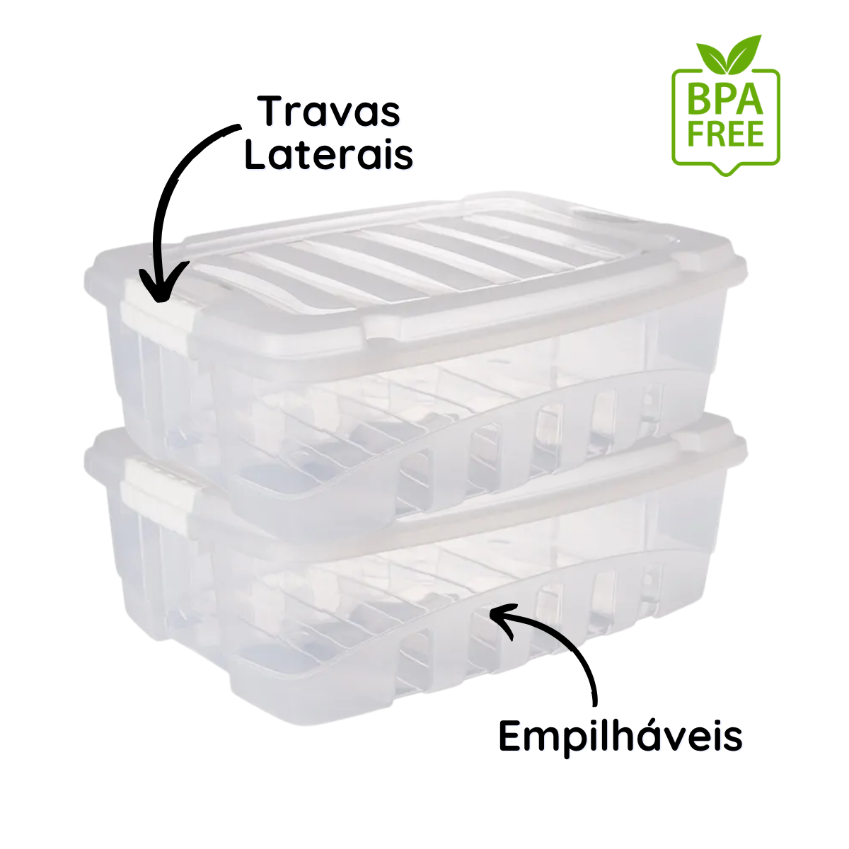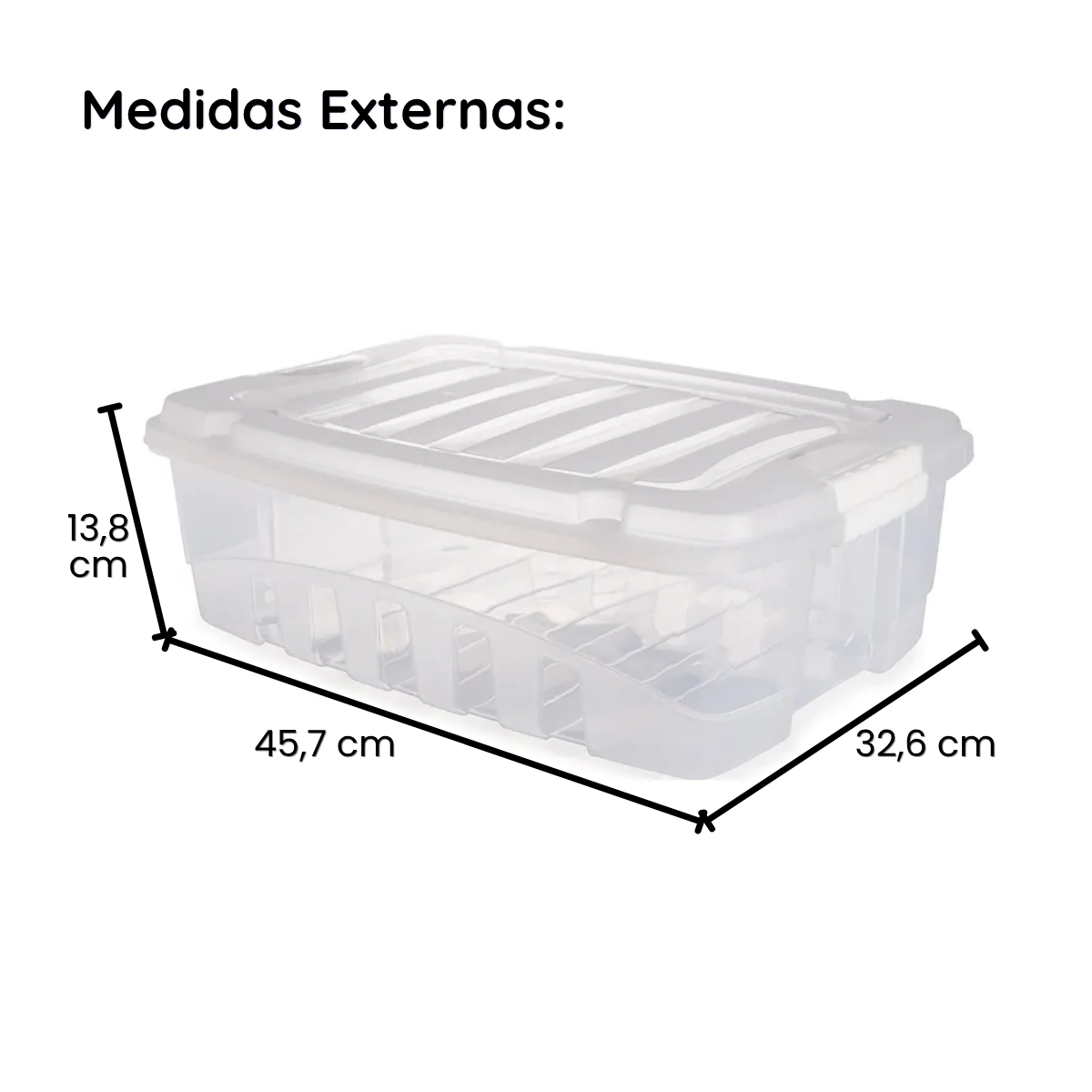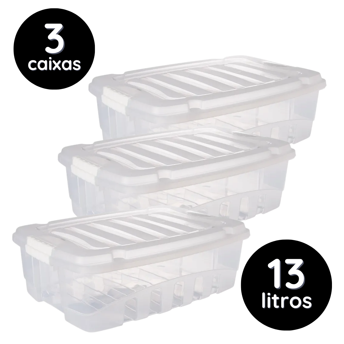 Kit 3 Caixas Organizadoras Gran Box Baixas 13L com Tampa e Travas Laterais – Transparente