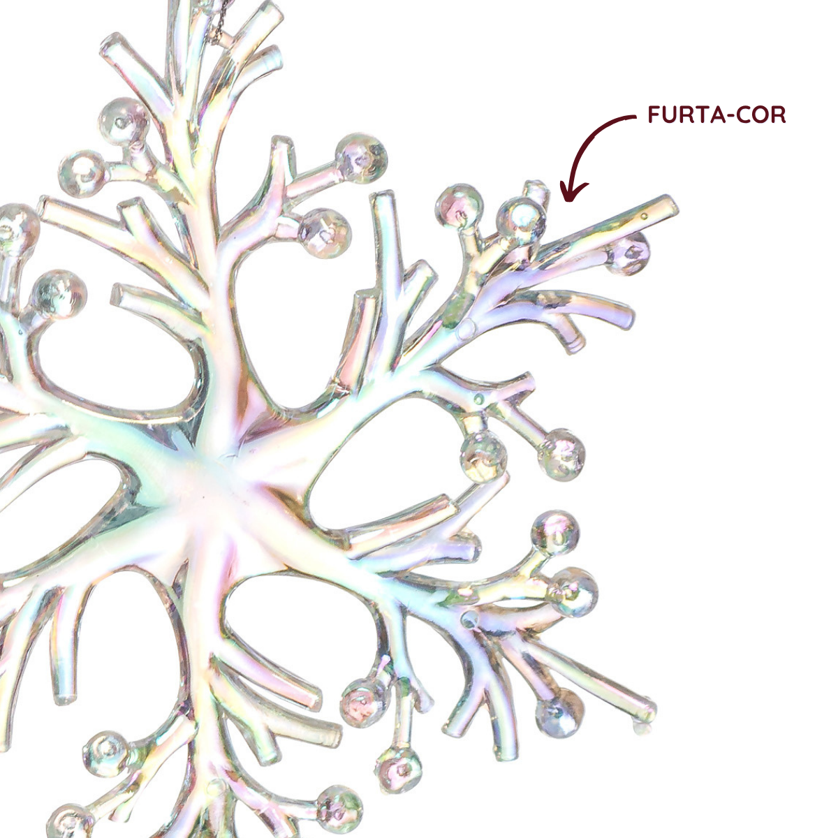 O Pendente Floco de Neve Furta-Cor é o toque de brilho que transforma qualquer decoração natalina em um cenário mágico. Com seu acabamento iridescente, ele reflete tons suaves e cintilantes, criando um efeito encantador sob a luz.